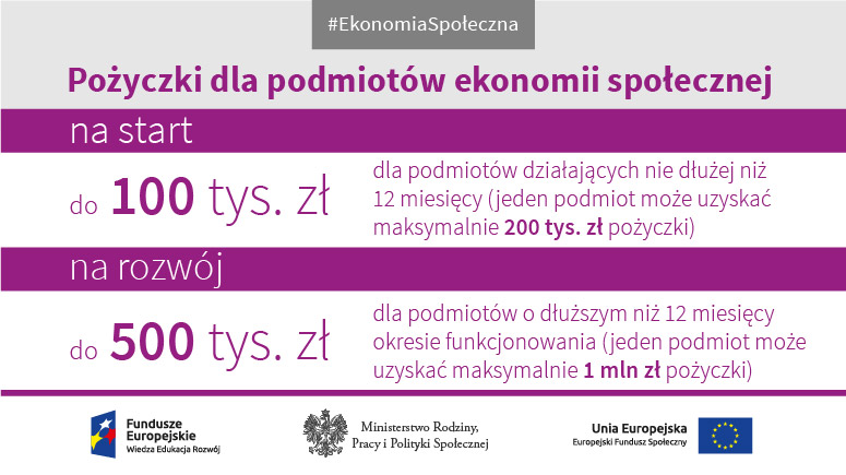 Pożyczka na rozwój do 500 tys. zł - dla podmiotów o dłuższym niż 12 miesięcy okresie funkcjonowania (jeden PES może uzyskać maksymalnie 1 mln zł pożyczki).