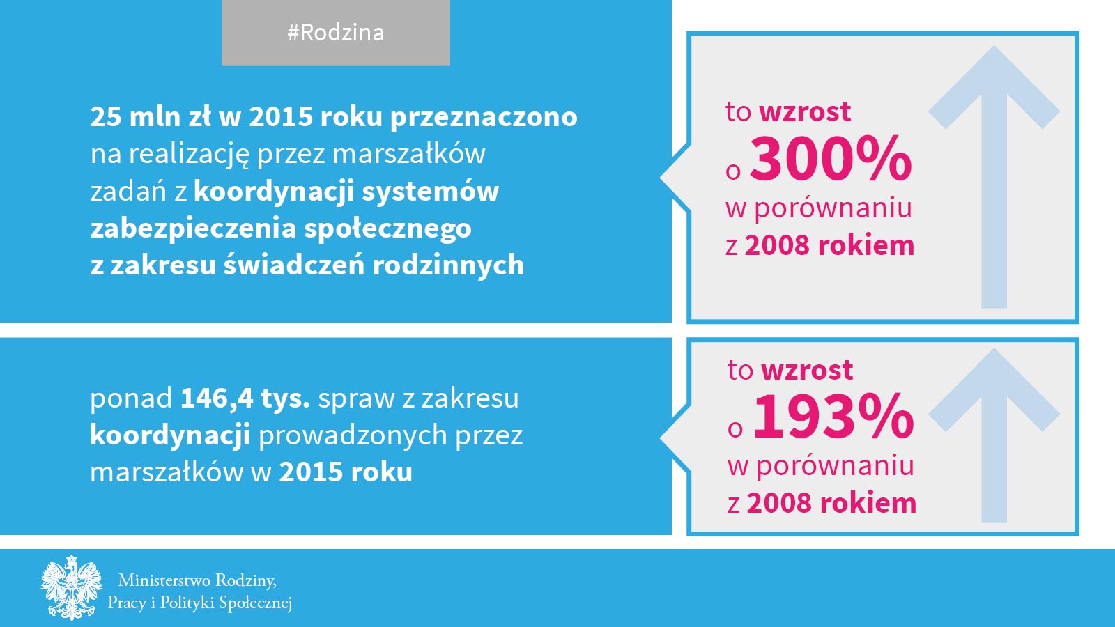 Zgłaszane zapotrzebowanie z roku na rok było także coraz wyższe. W 2008 r. wyniosło 8,2 mln zł, natomiast w 2015 r. niemal 25 mln zł, co oznacza wzrost o 300%. W tym czasie wzrost spraw z zakresu koordynacji prowadzonych przez marszałków wynosił 193%.
