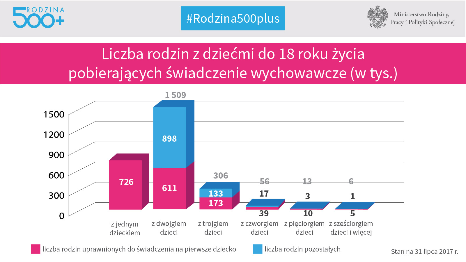 Świadczenie otrzymuje ponad 726 tys. rodzin z jednym dzieckiem do 18 r. życia. Rodzin pobierających świadczenia z dwójką dzieci jest ponad 1,509 mln, z trojgiem dzieci - 306 tys., z czworgiem - 56 tys., z pięciorgiem 13 tys., z sześciorgiem 6 tys.