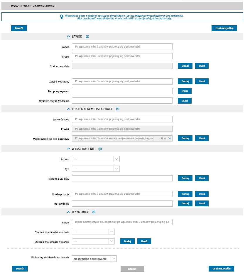 Drugim sposobem znalezienia przez pracodawcę interesujących go danych jest wyszukiwanie zaawansowane. Polega ono na możliwości określenia nowych kryteriów wyszukiwania. Chodzi tu m.in. o znajomość języków obcych, staż pracy w zawodzie czy typ wykształcenia