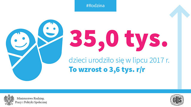 W lipcu 2017 r. urodziło się o 3,6 tys. dzieci więcej niż w lipcu ubiegłego roku (35,0 tys. w stosunku do 31,4 tys.). Łączna liczba urodzeń w okresie I-VII 2017 r. wyniosła 235,1 tys. i była wyższa o 18,2 tys. od liczby urodzeń w tym samym okresie w 2016 r. (216,9 tys.).