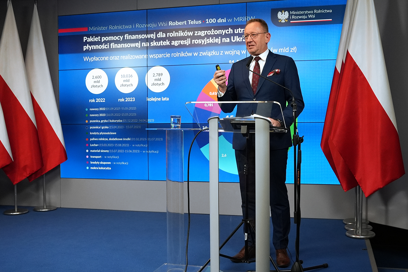 Ponad 15 mld zł pomocy dla rolników w związku z wojną w Ukrainie, skuteczny dialog z rolnikami, opróżnienie magazynów ze zbożem przed żniwami i nieformalna koalicja 5 państw przyfrontowych – to niektóre z sukcesów ministra rolnictwa i rozwoju wsi Roberta Telusa, które wskazał podczas dzisiejszej konferencji prasowej, podsumowującej jego pierwsze 100 dni na stanowisku szefa resortu.