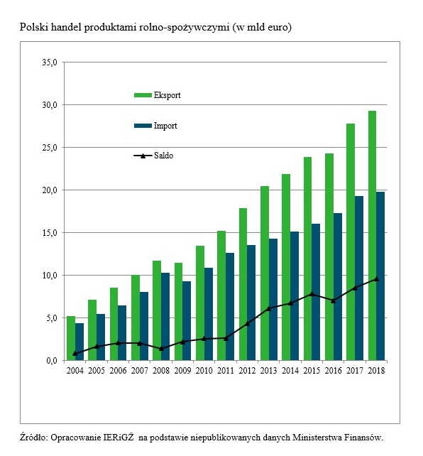 Od momentu przystąpienia Polski do UE rośnie dodatnie saldo wymiany handlowej produktami rolno-spożywczymi. Polska jest liderem w Unii Europejskiej w produkcji drobiu, owoców, pieczarek. Obecnie na eksport trafia 80% polskiej wołowiny, 45% drobiu i 30 % produktów mleczarskich. W 2018 r. wartość eksportu produktów rolno-spożywczych wyniosła prawie 30 mld euro. W porównaniu z 2004 rokiem oznacza to 6-krotny wzrost wartości sprzedaży żywności za granicą.