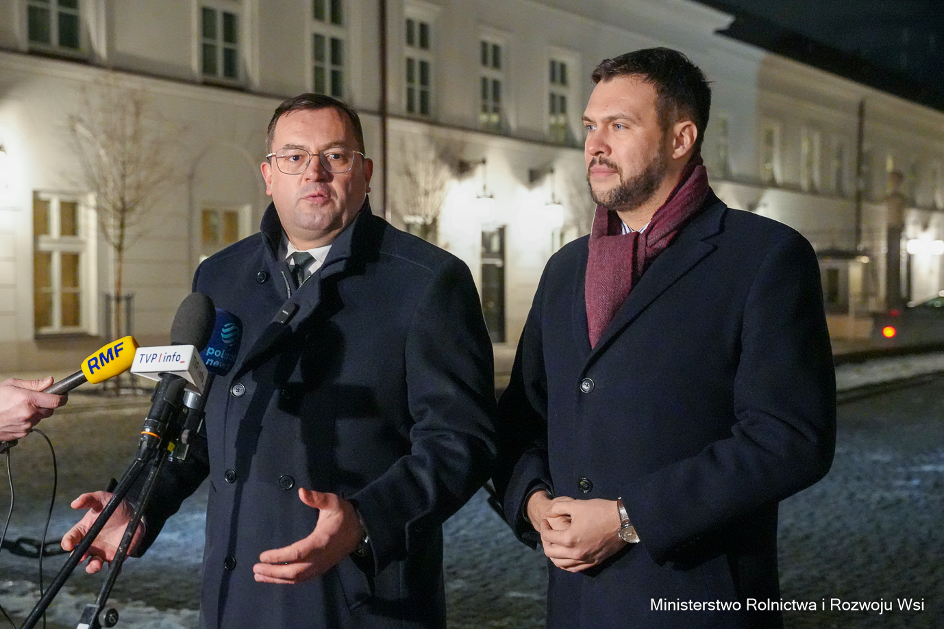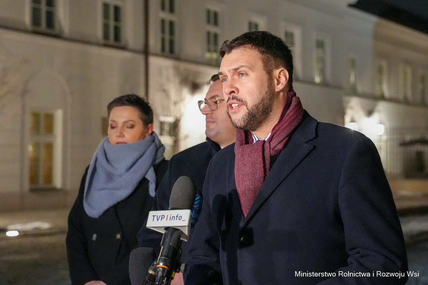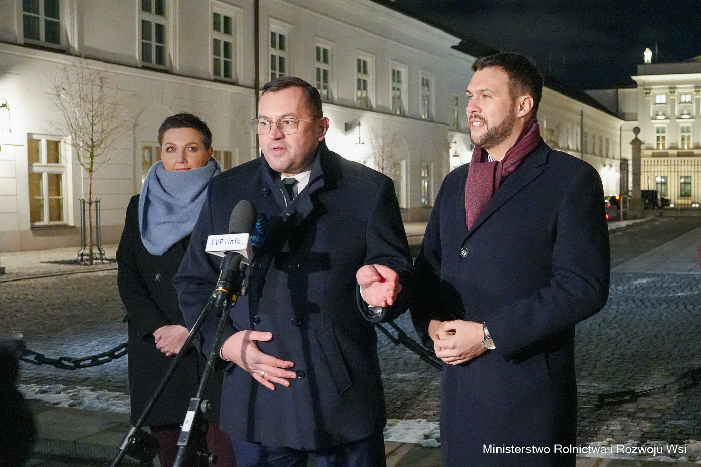 Wieczorem podczas briefingu przed Pałacem Prezydenckim do weta odnieśli się ministrowie Stefan Krajewski i Adam Nowak. Obaj podkreślali, że to nie służy rolnictwu, a szkodzi.