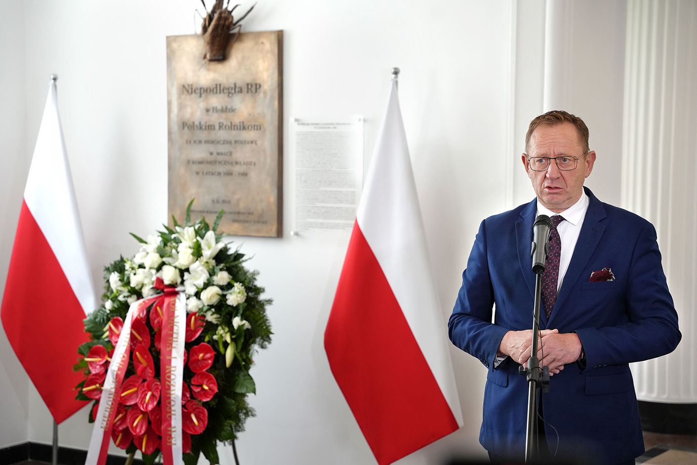 – Dzisiaj oddajemy cześć wszystkim synom polskiej wsi, którzy nie patrząc na koszty, bronili Polski. Oddali swoje zdrowie i życie za to, abyśmy mogli żyć w wolnej i niepodległej Polsce – powiedział minister Robert Telus w podczas uroczystości złożenia wieńców pod tablicą w siedzibie MRiRW, upamiętniającą heroiczną walkę rolników o wolność Ojczyzny.