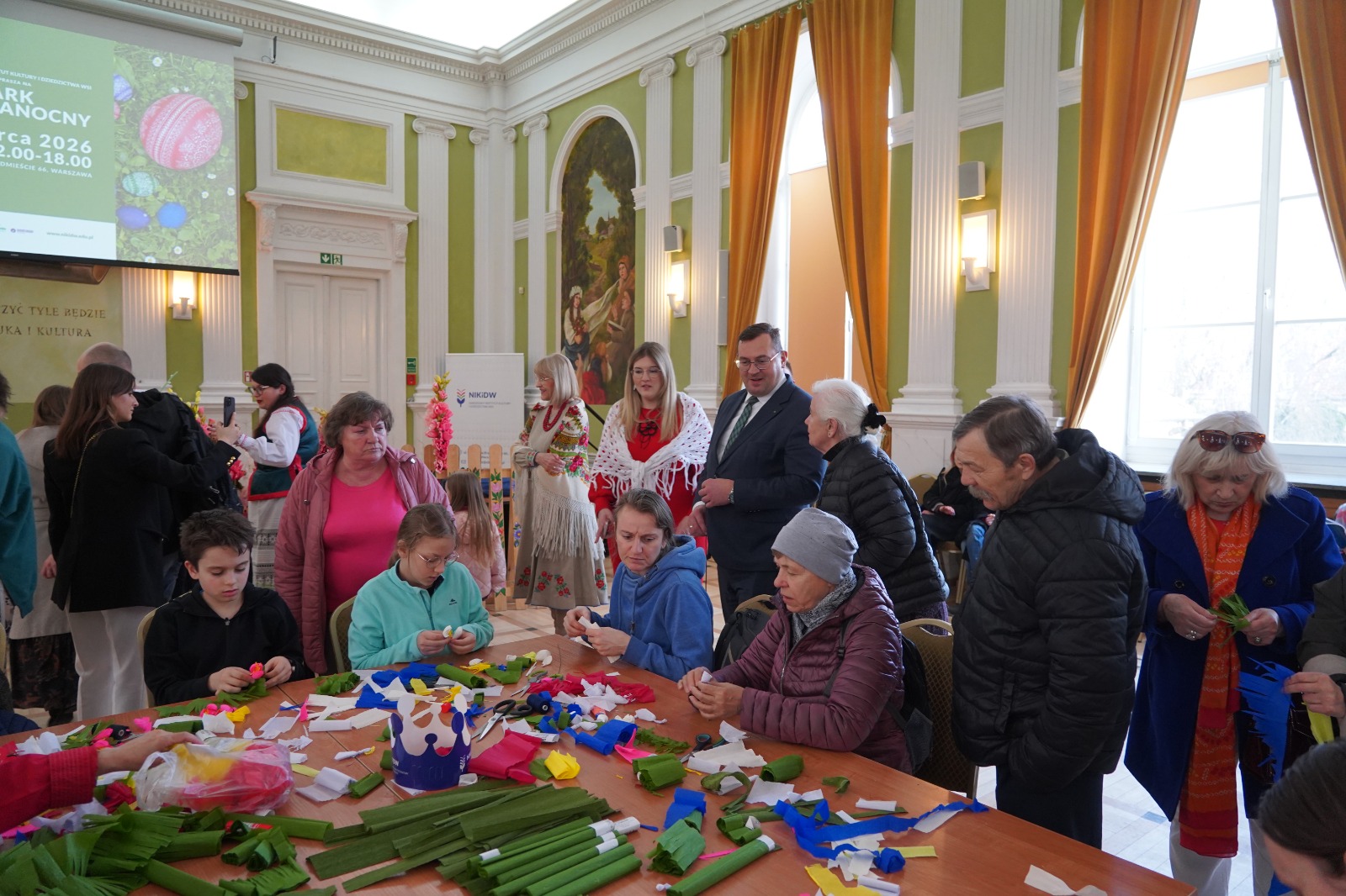 Punktem kulminacyjnym części warsztatowej było wspólne tworzenie monumentalnej palmy wielkanocnej. Pod okiem twórczyń ludowych, goście jarmarku połączyli siły, tworząc symbol, który stał się ozdobą całego wydarzenia.