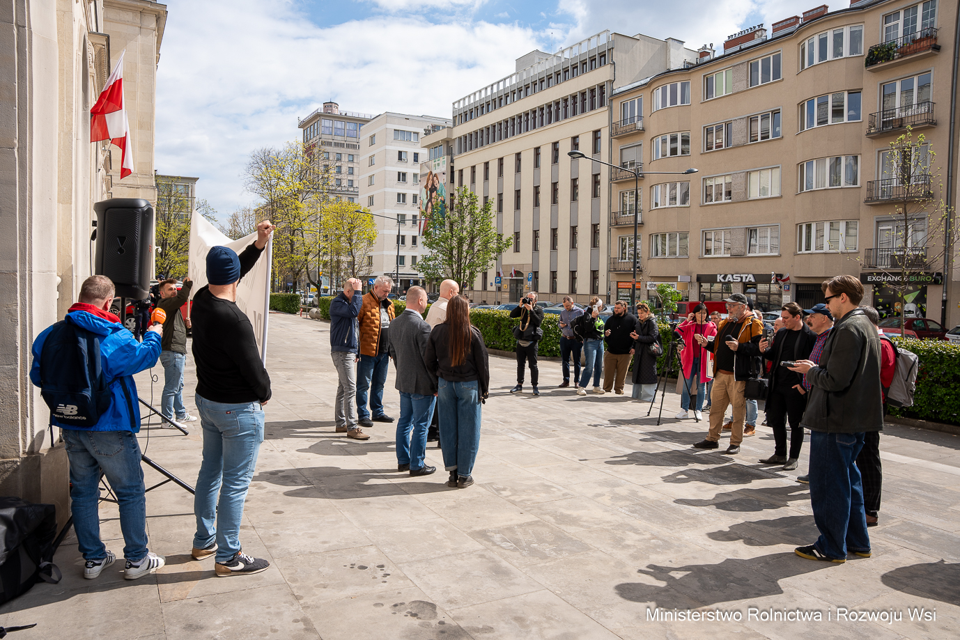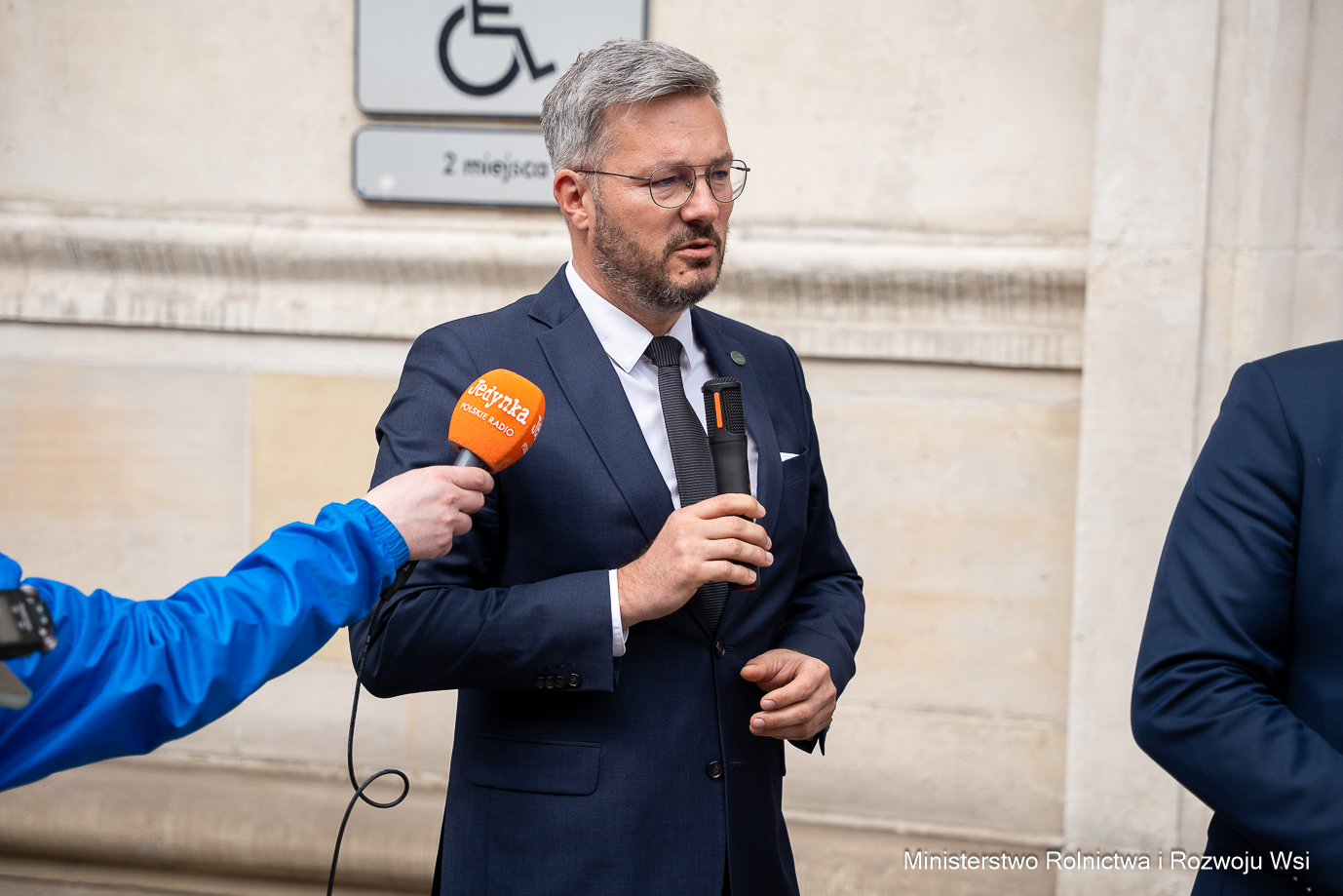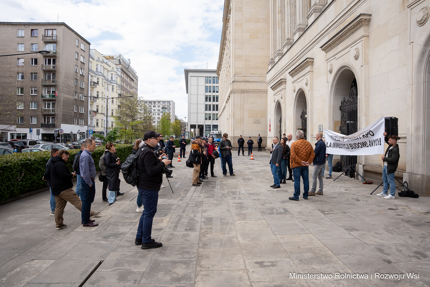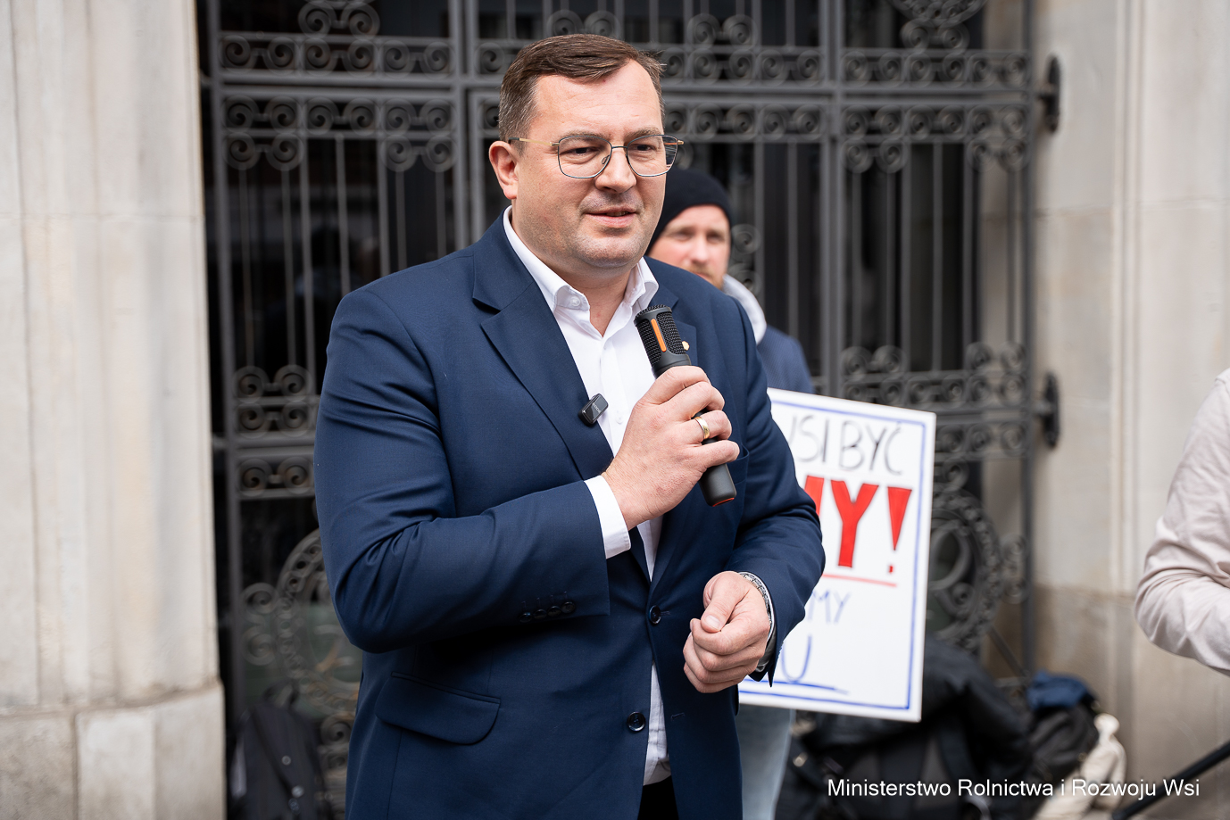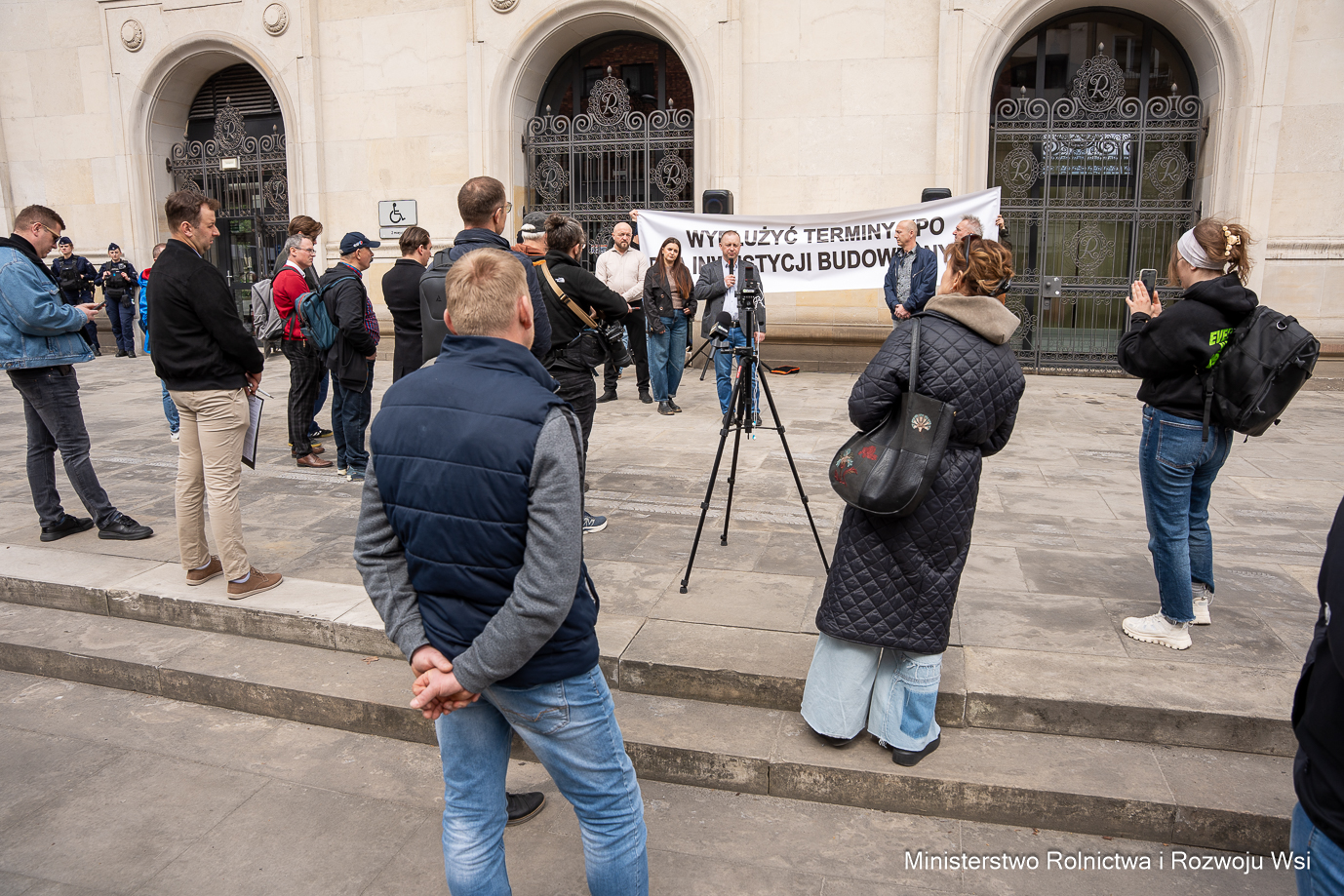 Minister rolnictwa i rozwoju wsi Stefan Krajewski spotkał się z rolnikami i przedsiębiorcami protestującymi przed siedzibą resortu. Środowisko rolnicze domaga się zmian w zasadach realizacji inwestycji w ramach Krajowego Planu Odbudowy.