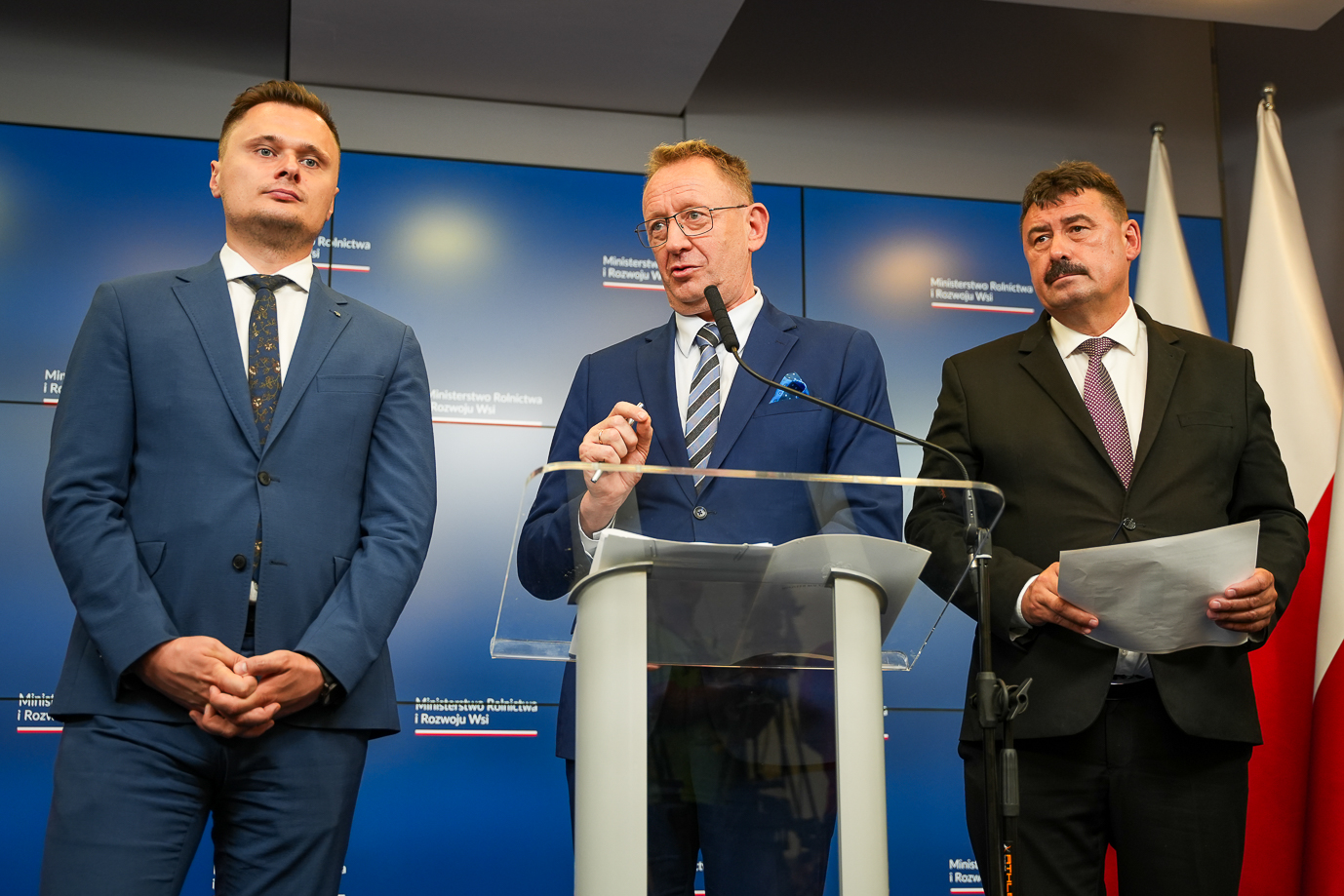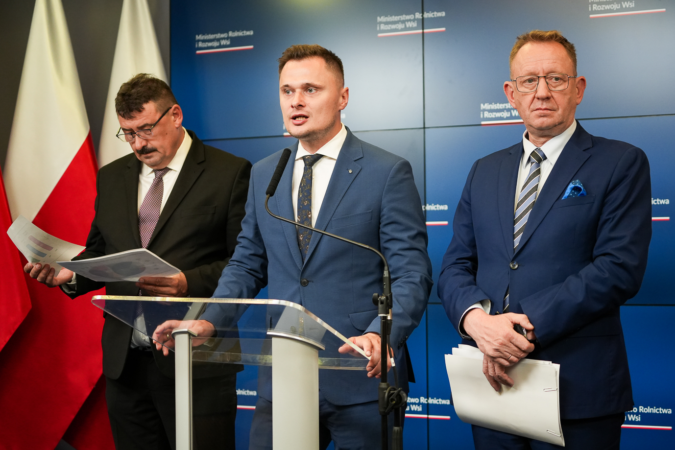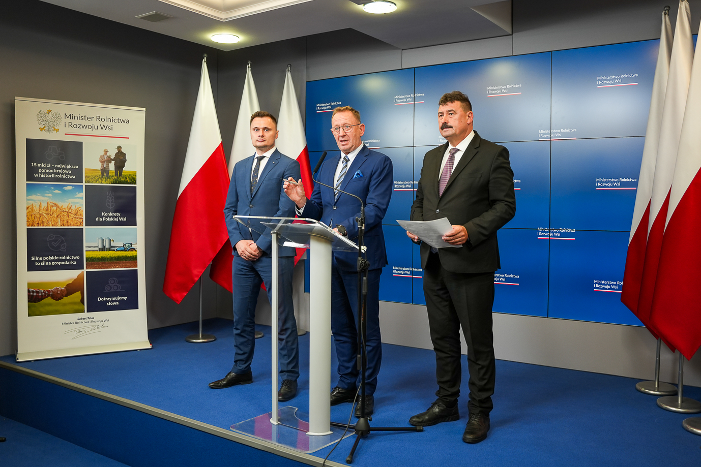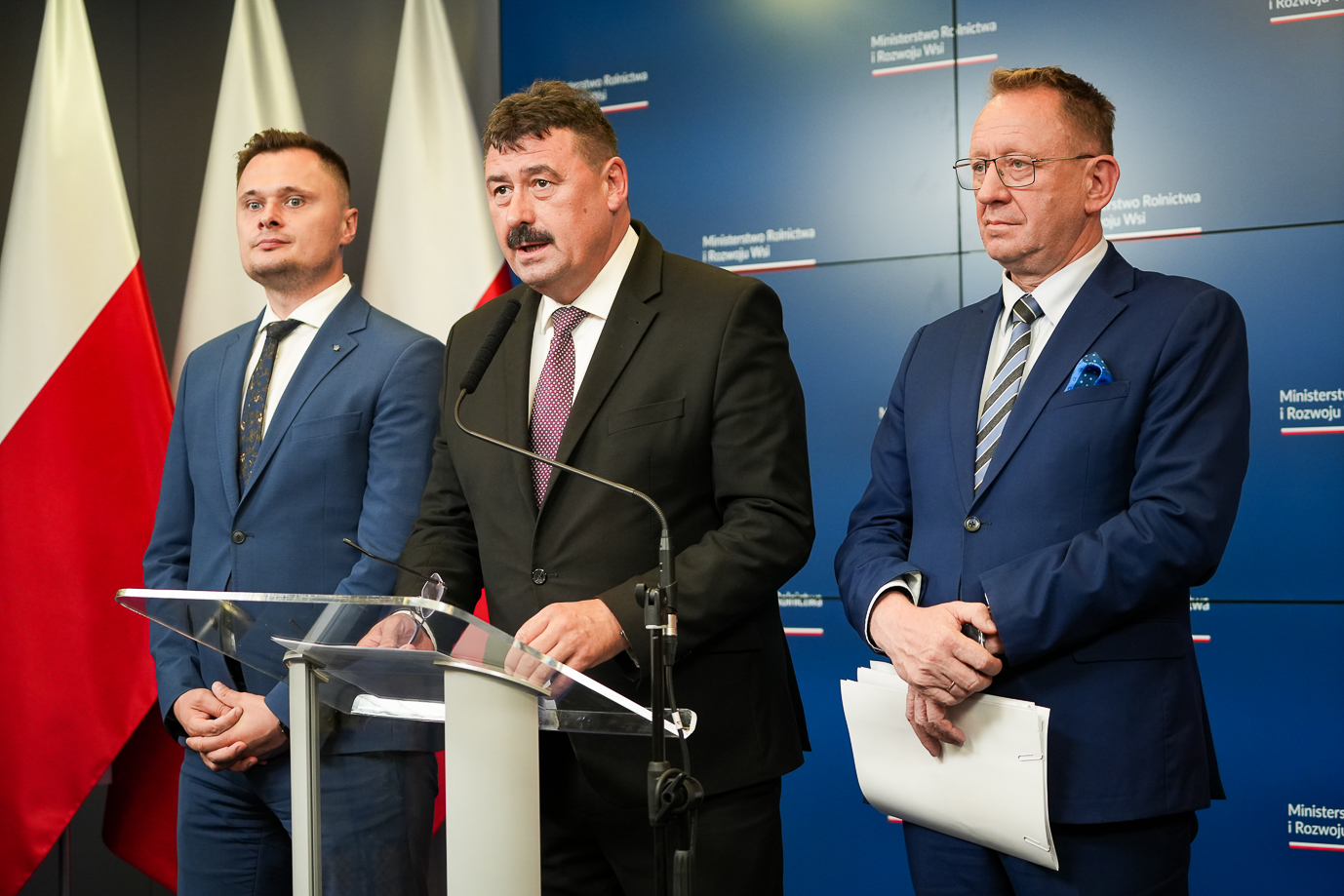 Minister rolnictwa i rozwoju wsi Robert Telus omówił dziś podczas konferencji prasowej aktualną sytuację w rolnictwie i przedstawił propozycje nowych rozwiązań. Towarzyszyli mu sekretarz stanu Ryszard Bartosik i podsekretarz stanu Krzysztof Ciecióra.
