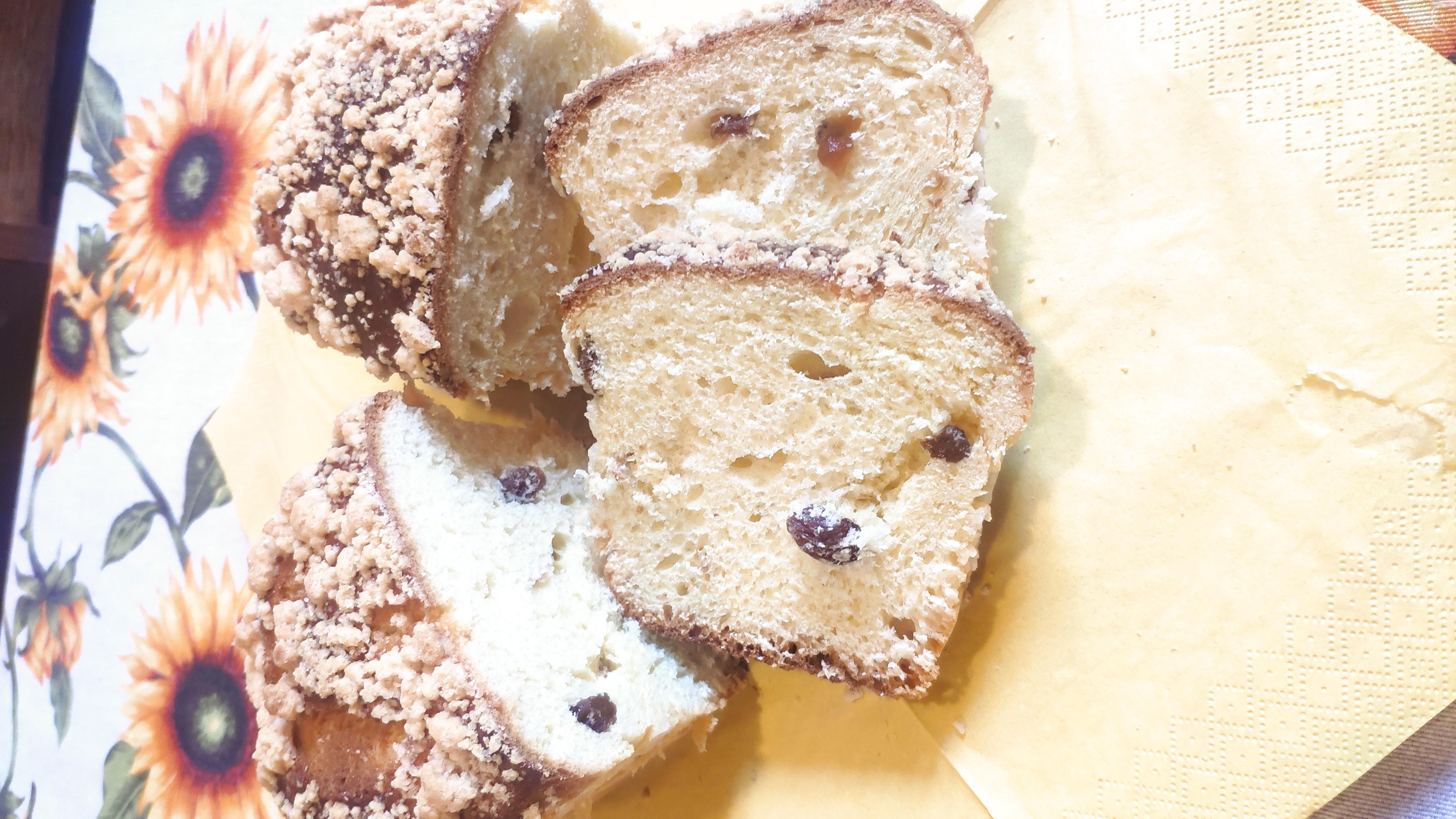 Po wypieczeniu jasny brąz, kruszonka w kolorze jasnego masła, miąższ jasny, słoneczny z widocznymi rodzynkami