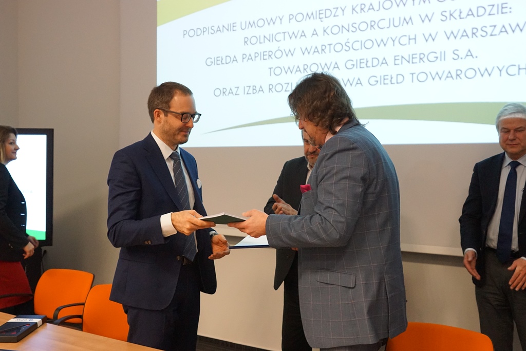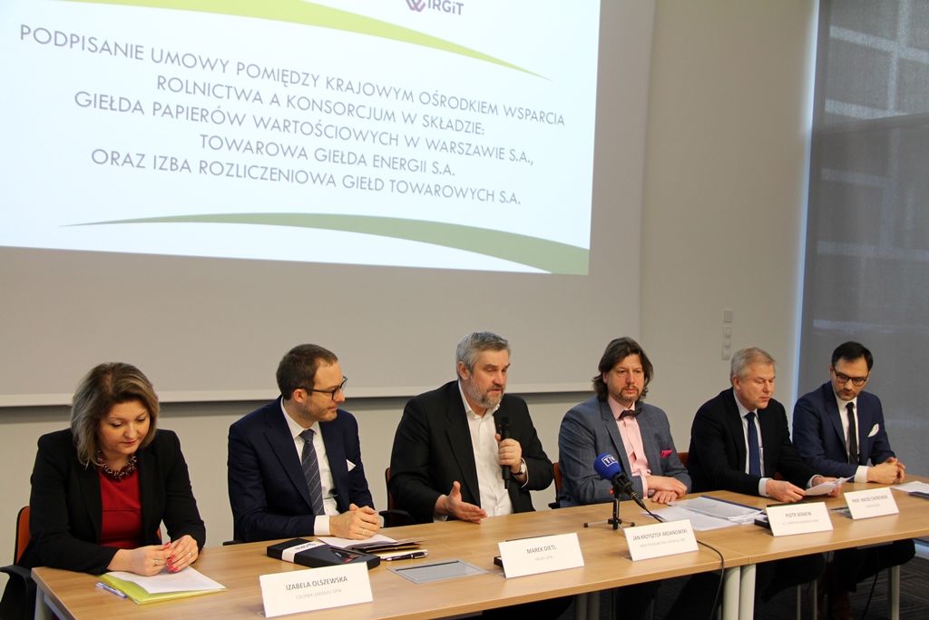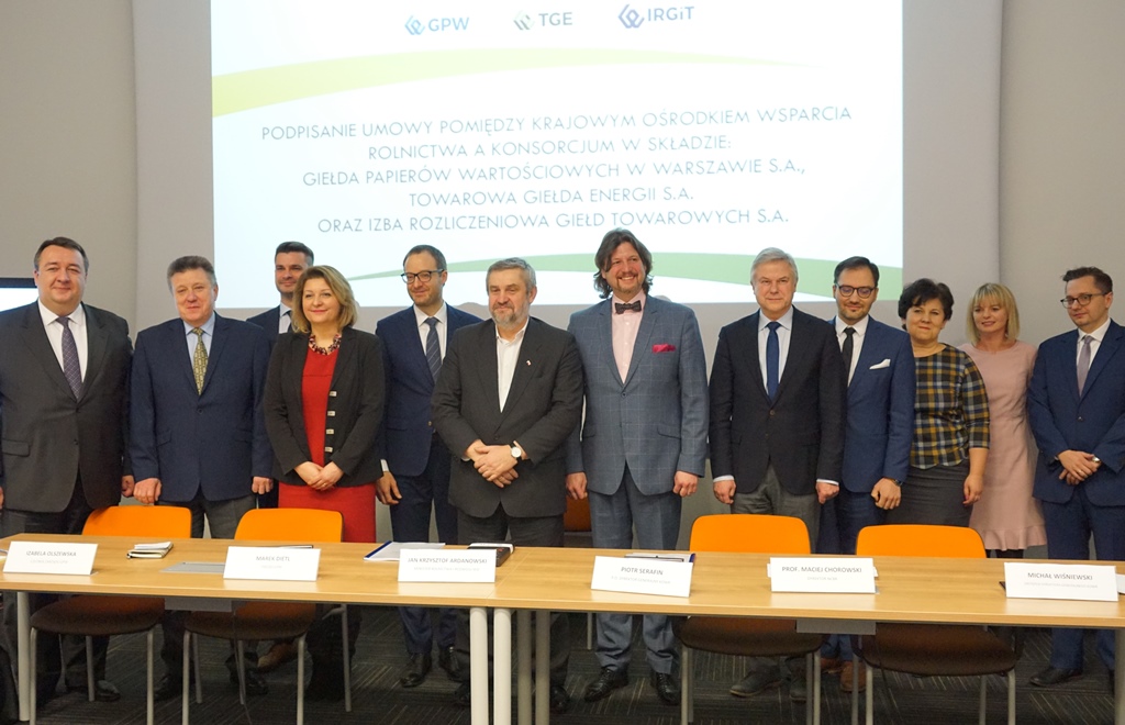 Dzisiaj podpisana została umowa na realizację trzech zadań w ramach projektu Platforma Żywnościowa pomiędzy Krajowym Ośrodkiem Wsparcia Rolnictwa a konsorcjum w składzie: Giełda Papierów Wartościowych w Warszawie S.A., Towarowa Giełda Energii S.A. oraz Izba Rozliczeniowa Giełd Towarowych S.A.