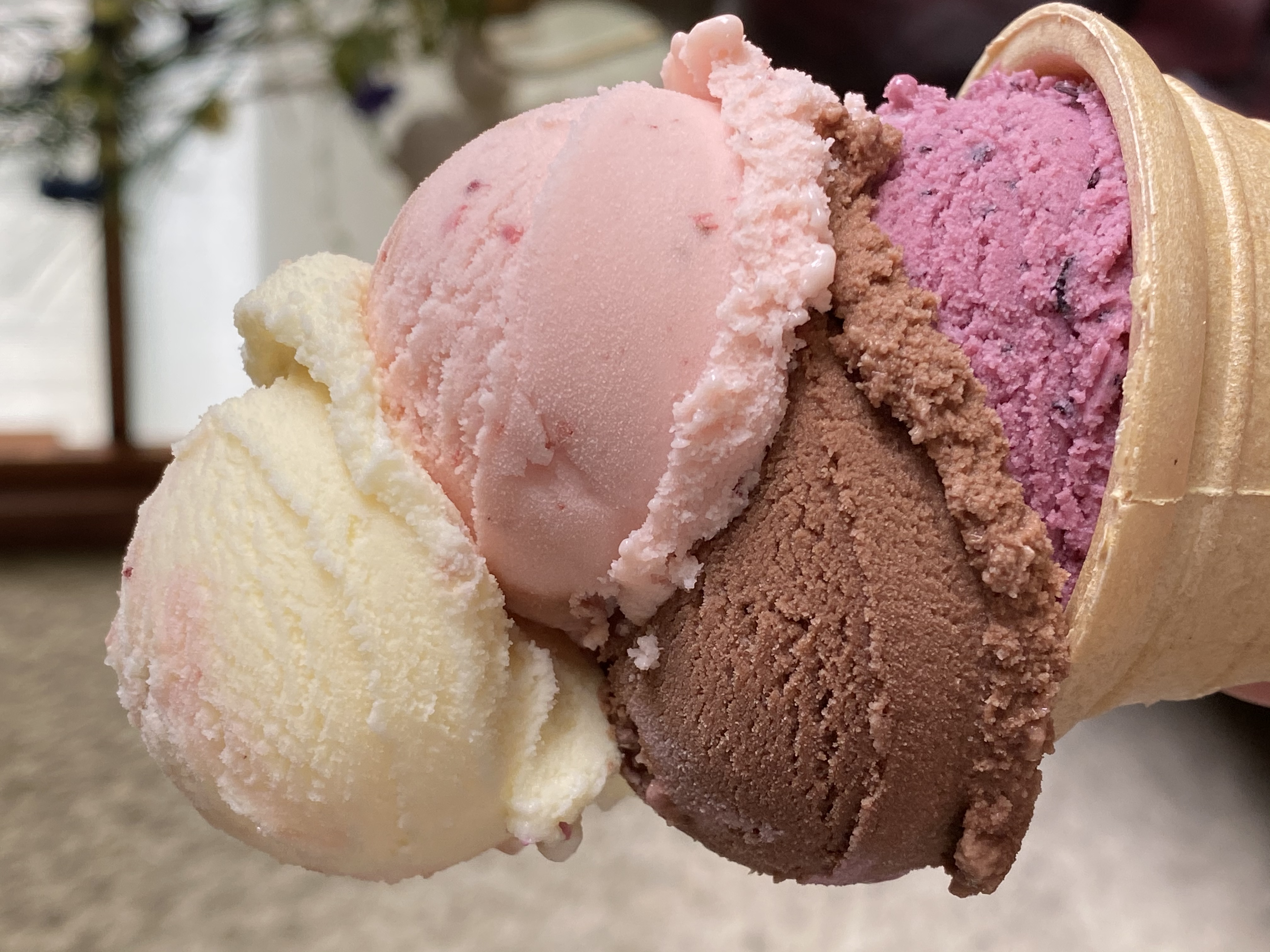 Barwa zależy od smaku lodów, wanilia – kremowa, kakao – brąz, truskawka – róż, pistacja – zieleń, jagoda – purpura/fiolet, kawa – brąz