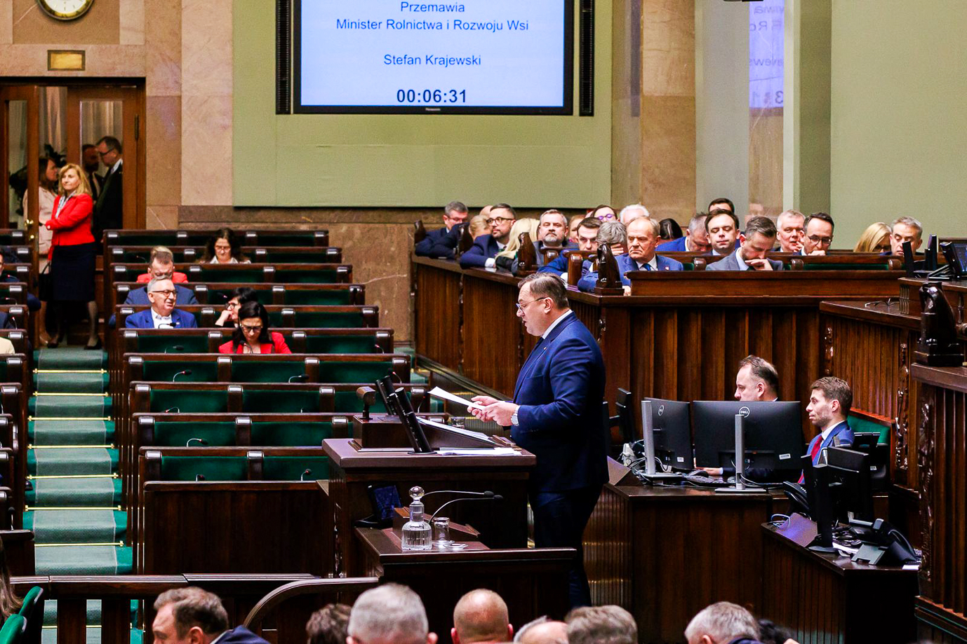 Podczas sejmowej debaty poprzedzającej głosowanie nad wotum zaufania minister rolnictwa i rozwoju wsi Stefan Krajewski przedstawił szczegółowy bilans działań resortu. W wystąpieniu odniósł się do umowy UE-Mercosur, sytuacji na rynku zbóż po napływie produktów z Ukrainy, opłacalności produkcji rolnej, poprawy sytuacji w zakresie ASF oraz rekordowych wyników eksportu polskiej żywności.