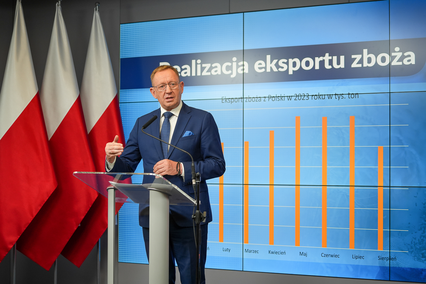 Podczas dzisiejszej konferencji prasowej minister Robert Telus przedstawił dane dotyczące eksportu zboża z Polski.