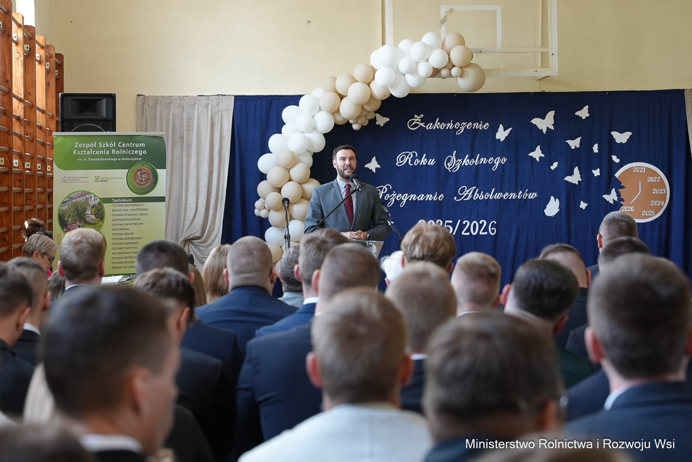 W piątek, 24 kwietnia 2026 r., w 66 szkołach rolniczych prowadzonych przez Ministra Rolnictwa i Rozwoju Wsi odbyły się uroczystości zakończenia edukacji dla abiturientów. Podsekretarz stanu Adam Nowak wziął udział w uroczystym pożegnaniu absolwentów Zespołu Szkół Centrum Kształcenia Rolniczego (ZSCKR) im. Aleksandra Świętochowskiego w Gołotczyźnie.