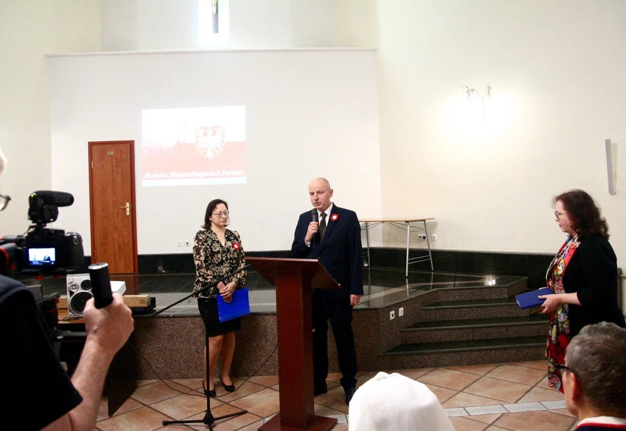 W swym wystąpieniu Jacek Śladewski przekazał zebranym najlepsze życzenia z okazji Święta. Podkreślił wagę pielęgnowania polskiego języka, tradycji i kultury narodowej oraz wyraził słowa uznania i podziękowania dla wszystkich Rodaków w Rosji, którzy pomimo przeciwności i utrudnień trwają w polskości i pozostają jej wierni. Przypomniał, że w sobotę 12 listopada w Świątyni Opatrzności Bożej miał miejsce pochówek trzech prezydentów: Władysława Raczkiewicza, Augusta Zalewskiego i Stanisława Ostrowskiego, co uczyniło tegoroczne obchody Narodowego Święta Niepodległości szczególnymi oraz ugruntowało pozycję Świątyni jako narodowego panteonu.
