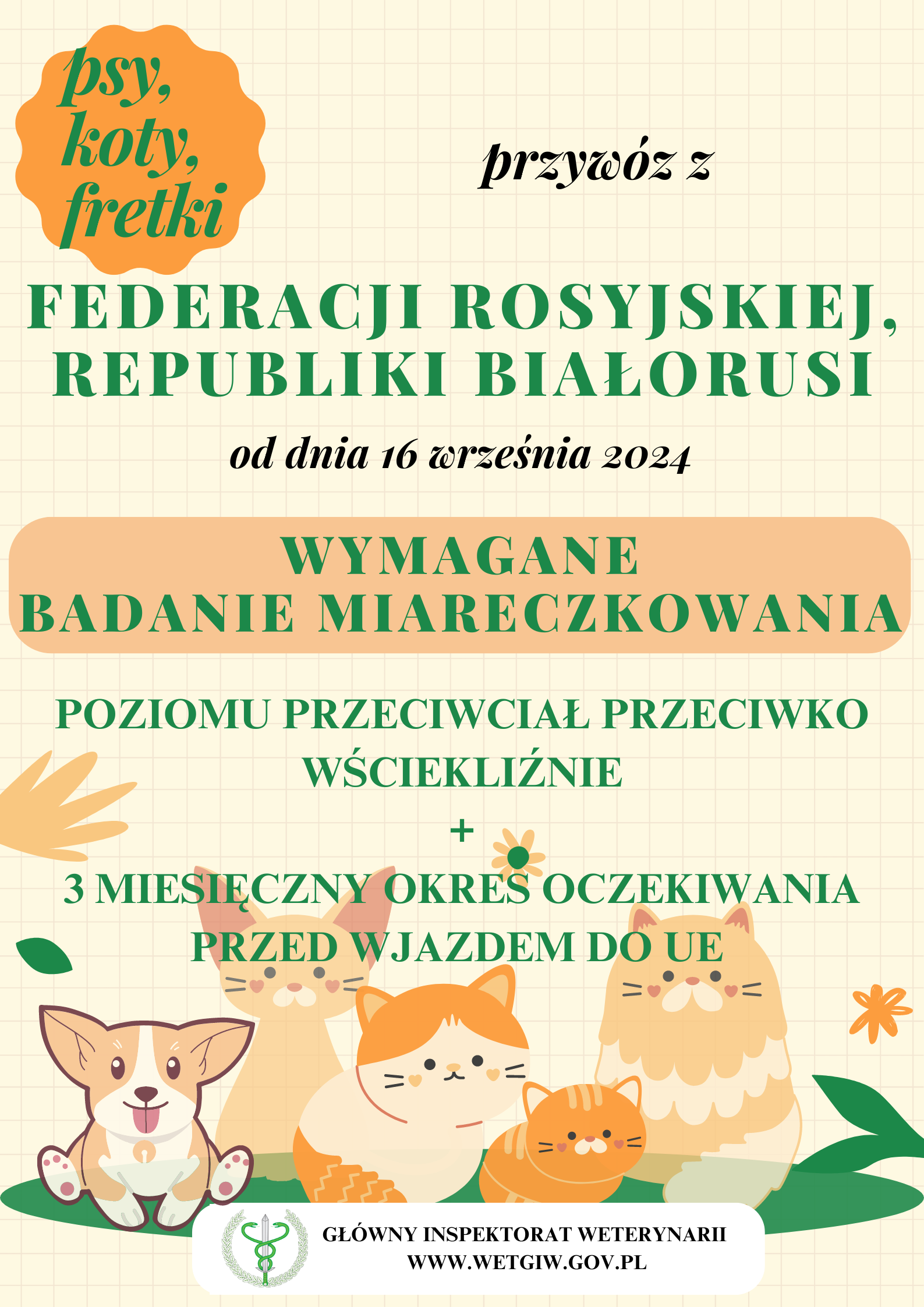 Od dnia 16 września 2024 r. wymagane będzie badanie miareczkowania poziomu przeciwciał przeciwko wściekliźnie, co wiąże się z 3 miesięcznym okresem oczekiwania psów, kotów i fretek przed wjazdem na teren UE liczonym od dnia pobrania krwi do badania.