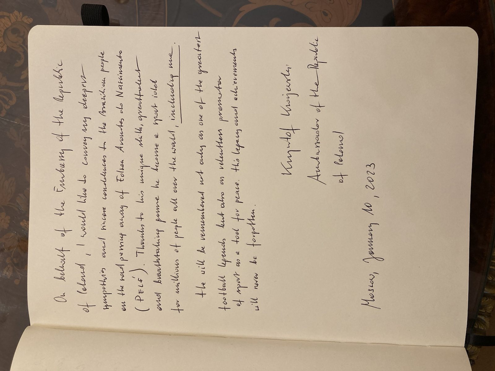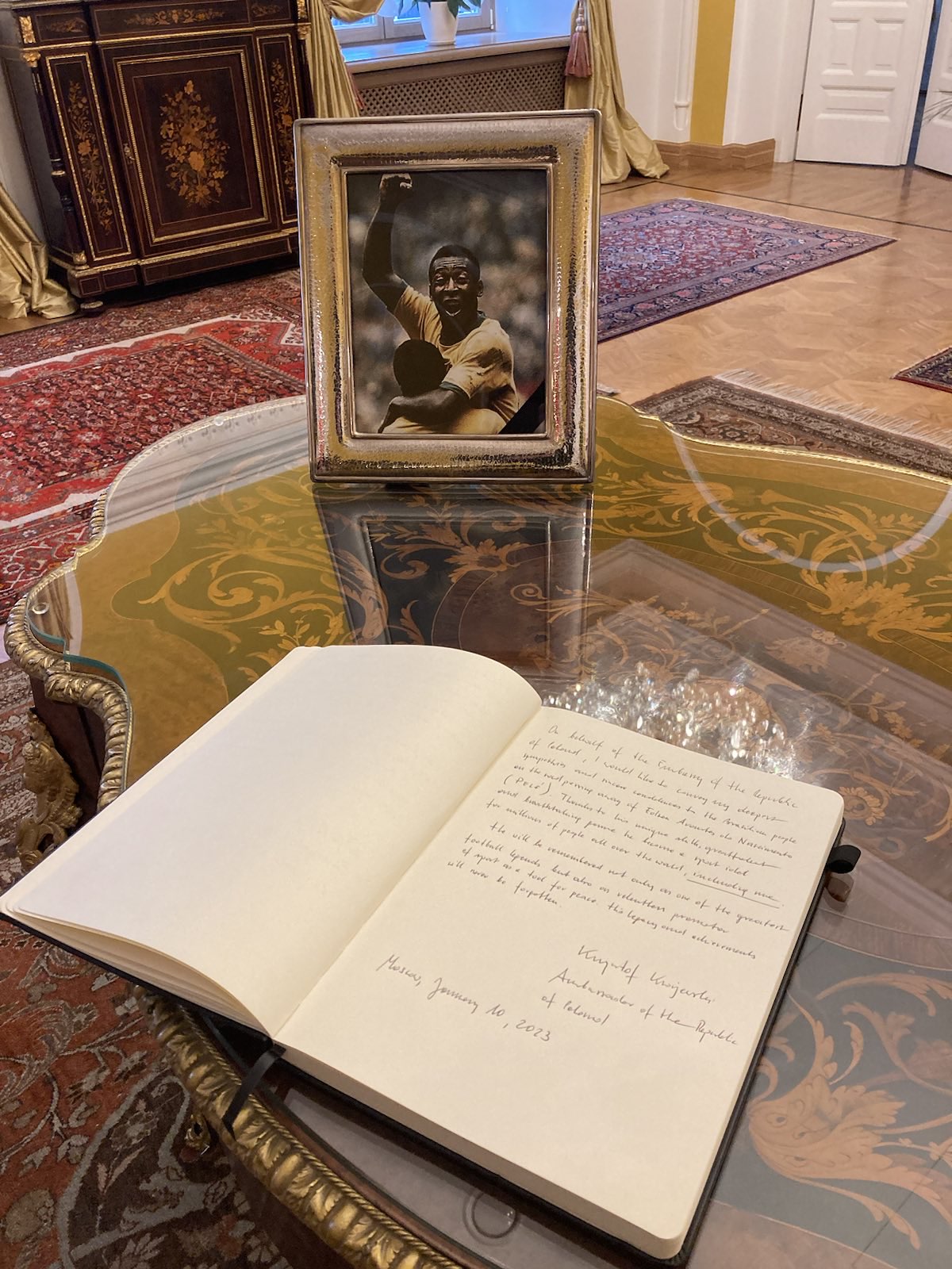 10.01. Посол Кшиштоф Краевски отправился в Посольство Федеративной Республики Бразилии в Москве, чтобы отдать дань памяти скончавшемуся легендарному футболисту Пеле - Эдсону Арантису ду Насименту, делая запись в книге соболезнований.