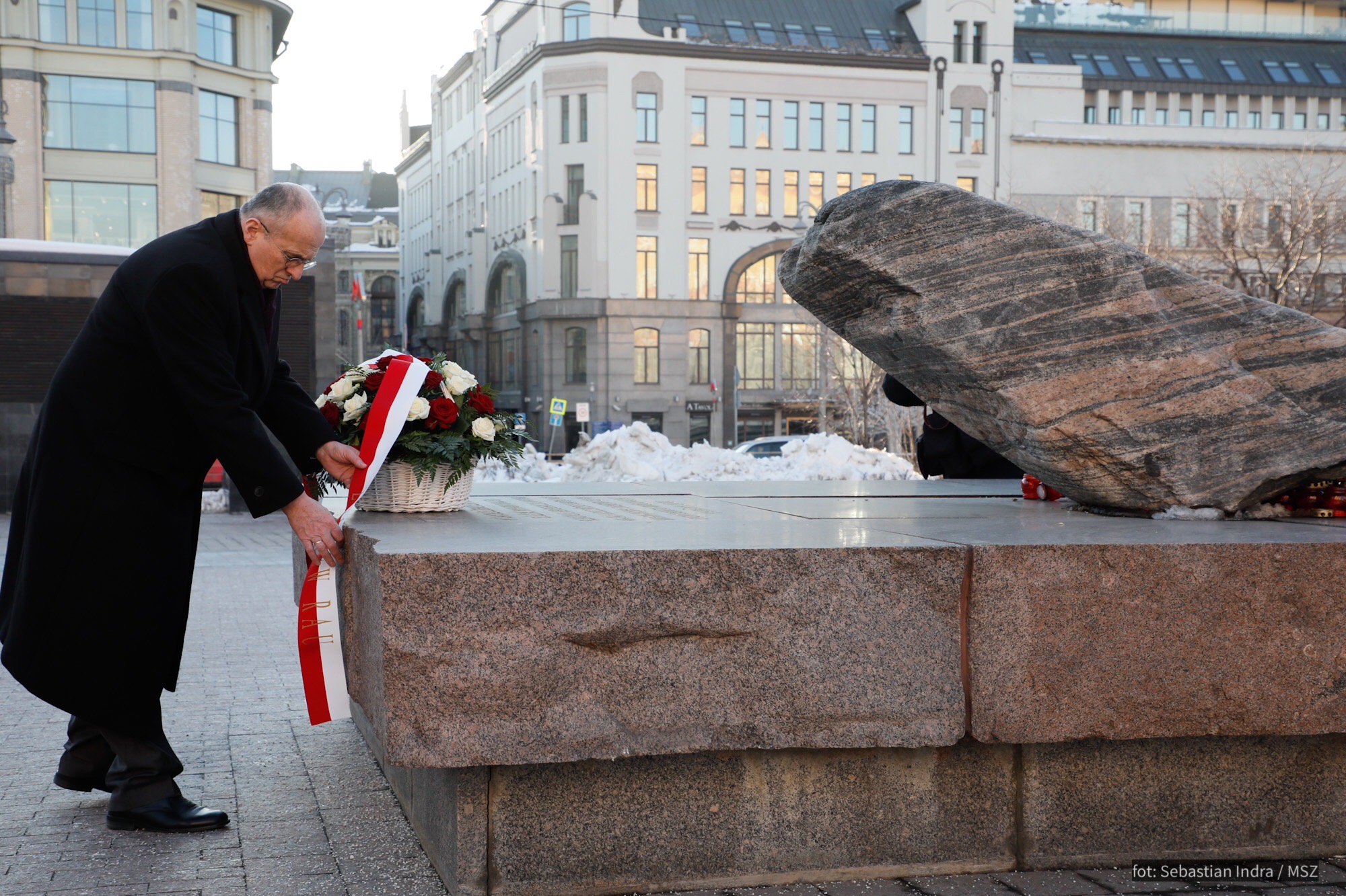 Министр в сопровождении Посла Кшиштофа Краевского почтил память жертв политических репрессий и возложил цветы к «Стене Скорби» и к «Соловецкому камню» на Лубянке.