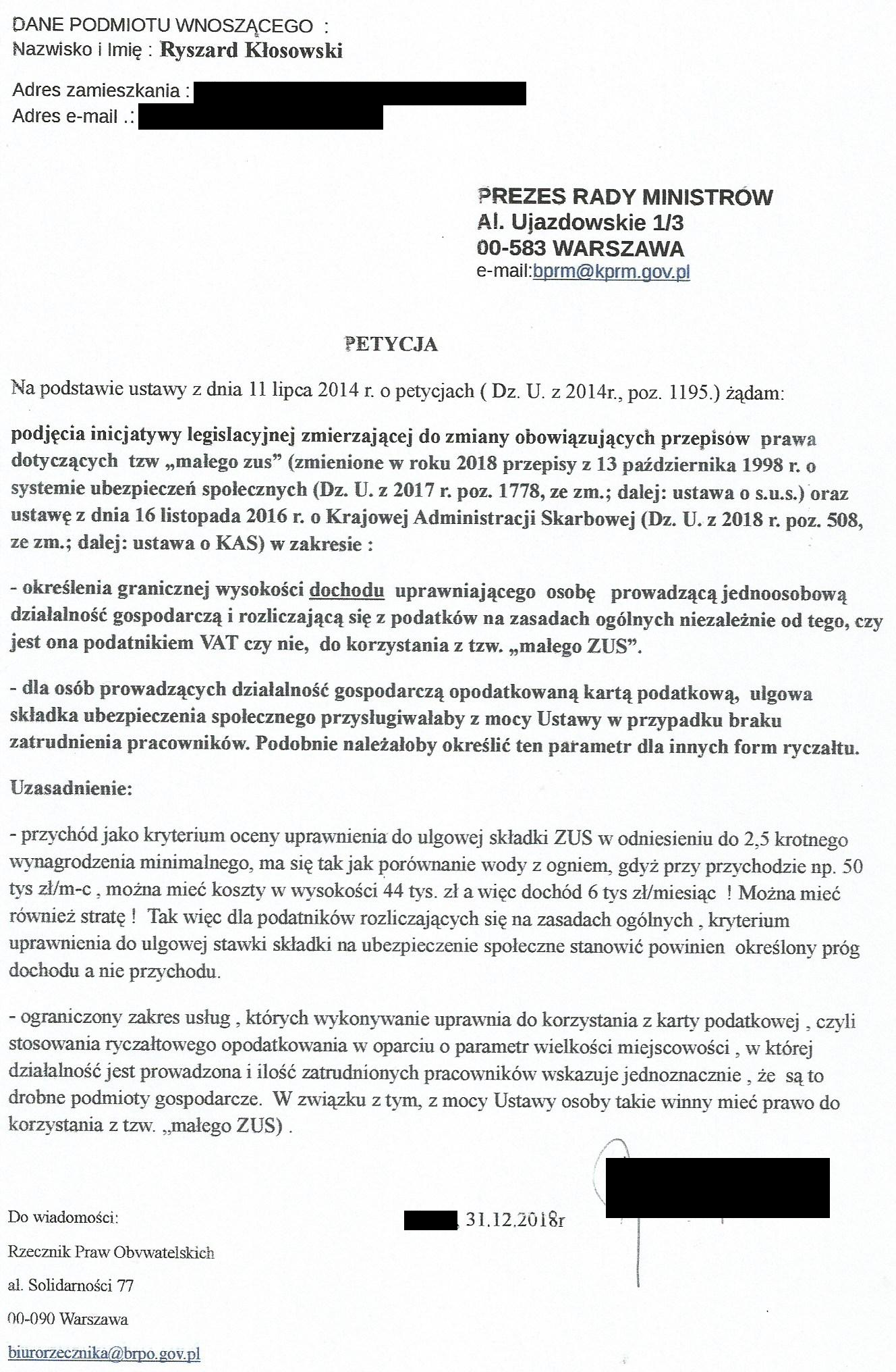 1/2019 Petycja w sprawie ustawy o tzw. małym ZUS