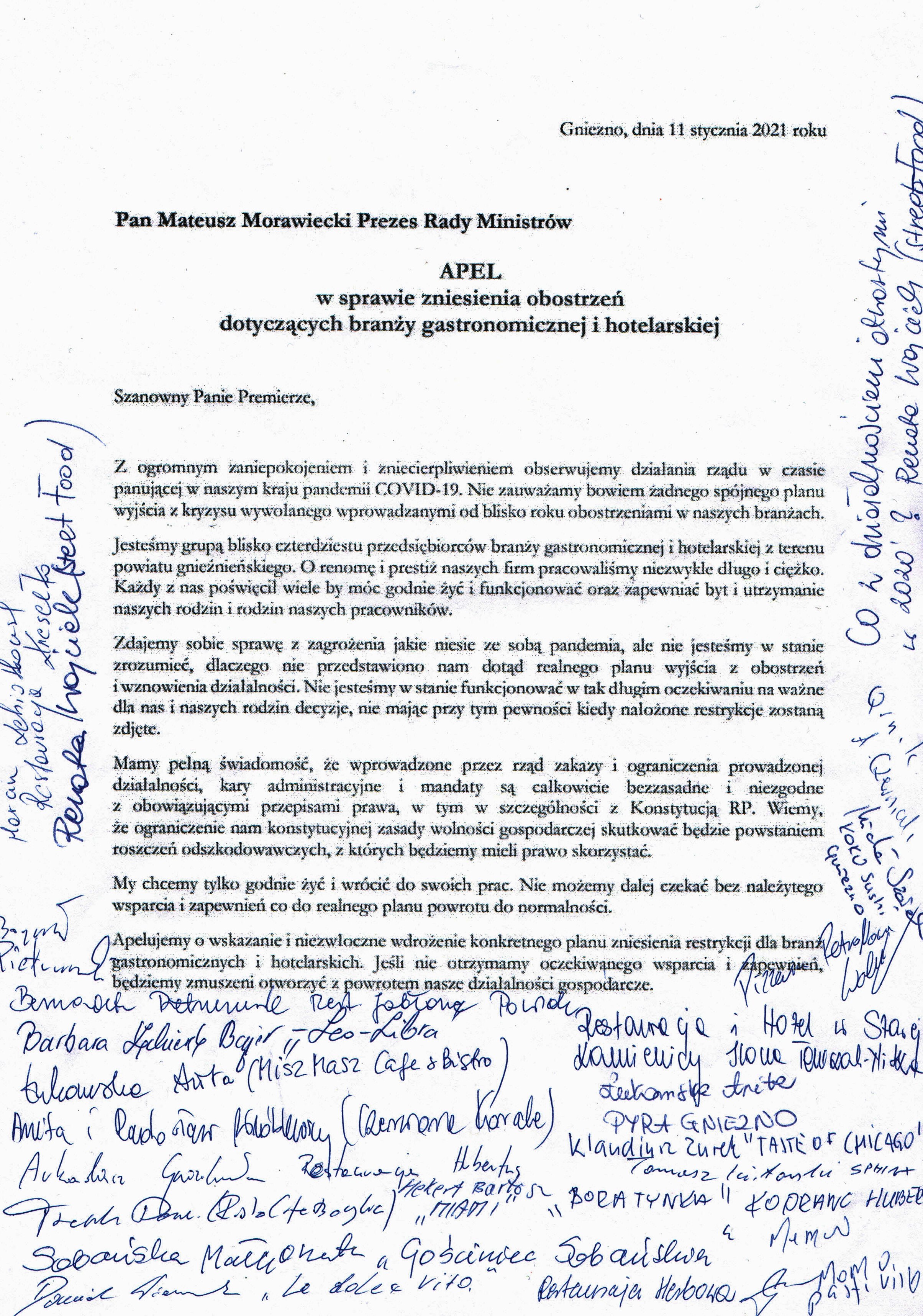 - Petycja w sprawie zniesienia obostrzeń dla branży gastronomicznej i hotelarskiej