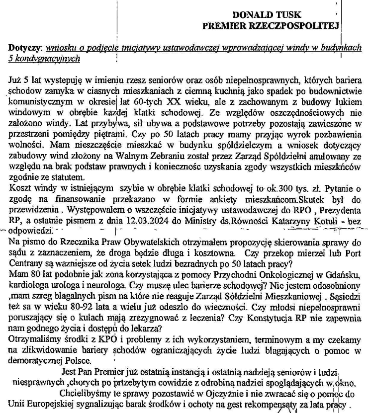 38/2024 Petycja w sprawie konieczności zapewnienia dźwigu osobowego w budynkach pięciokondygnacyjnych oraz możliwości wykorzystania środków z KPO