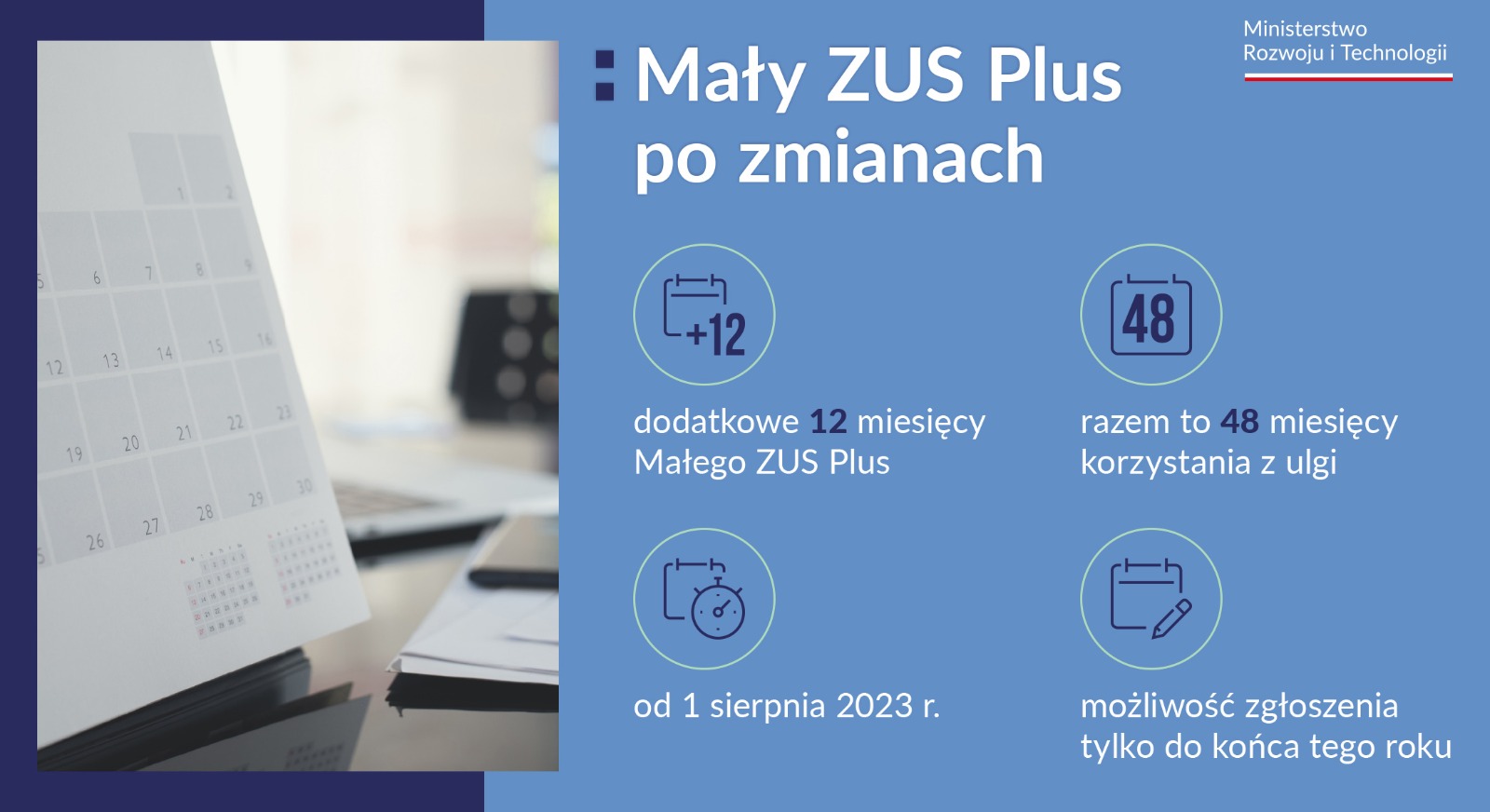 Wydłużamy Mały ZUS Plus o rok dla przedsiębiorców, którzy korzystają z ulgi w 2023 r. Dzięki temu rozwiązaniu zaoszczędzą nawet kilkaset złotych miesięcznie. Proponowane zmiany zostały przygotowane wspólnie przez Ministerstwo Rozwoju i Technologii, Ministerstwo Rodziny i Polityki Społecznej oraz Zakład Ubezpieczeń Społecznych. Wejdą w życie 1 sierpnia br.