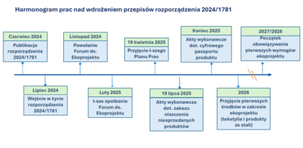 Aby zapewnić odpowiednie informowanie społeczeństwa i interesariuszy o zasadach wynikających z rozporządzenia 2024/1781, KE opublikowała pierwszy Plan prac w zakresie ekoprojektu COM(2025) 187, przyjęty 16 kwietnia 2025 r. Plan obejmuje okres lat 2025-2030, z przeglądem śródokresowym w 2028 r., i wskazuje priorytetowe grupy produktów, dla których w pierwszej kolejności zostaną opracowane wymogi ekoprojektu. Należą do nich: tekstylia/odzież, meble, materace, opony, żelazo i stal oraz aluminium. Dokument zawiera także orientacyjny harmonogram opracowywania aktów delegowanych dla tych produktów oraz działania wspierające nadzór rynku.