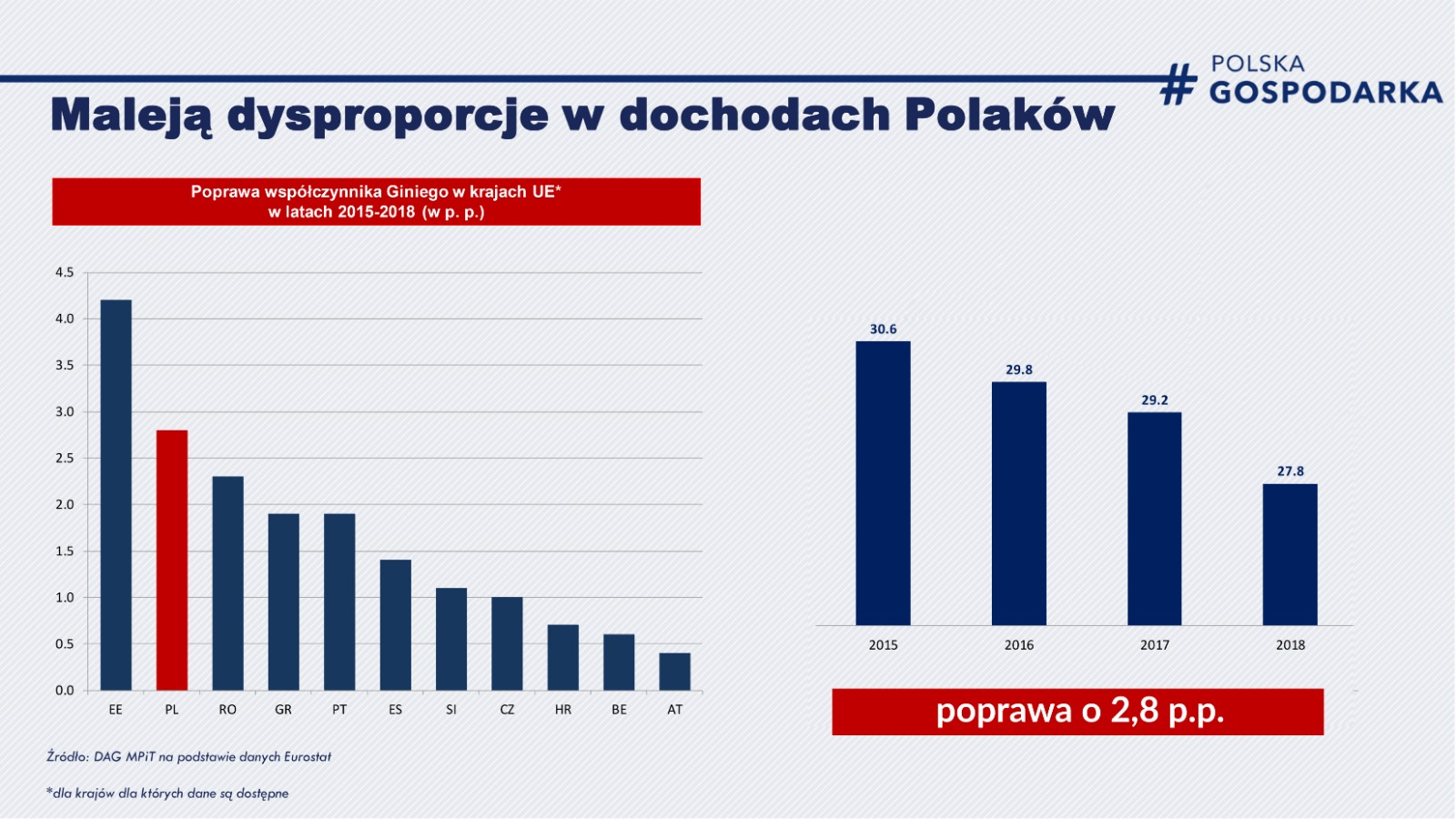 W 2018 r. wskaźnik ten wyniósł w Polsce 27,8%. To oznacza poprawę o 2,8 p. p. w stosunku do 2015 r. (30,6%).