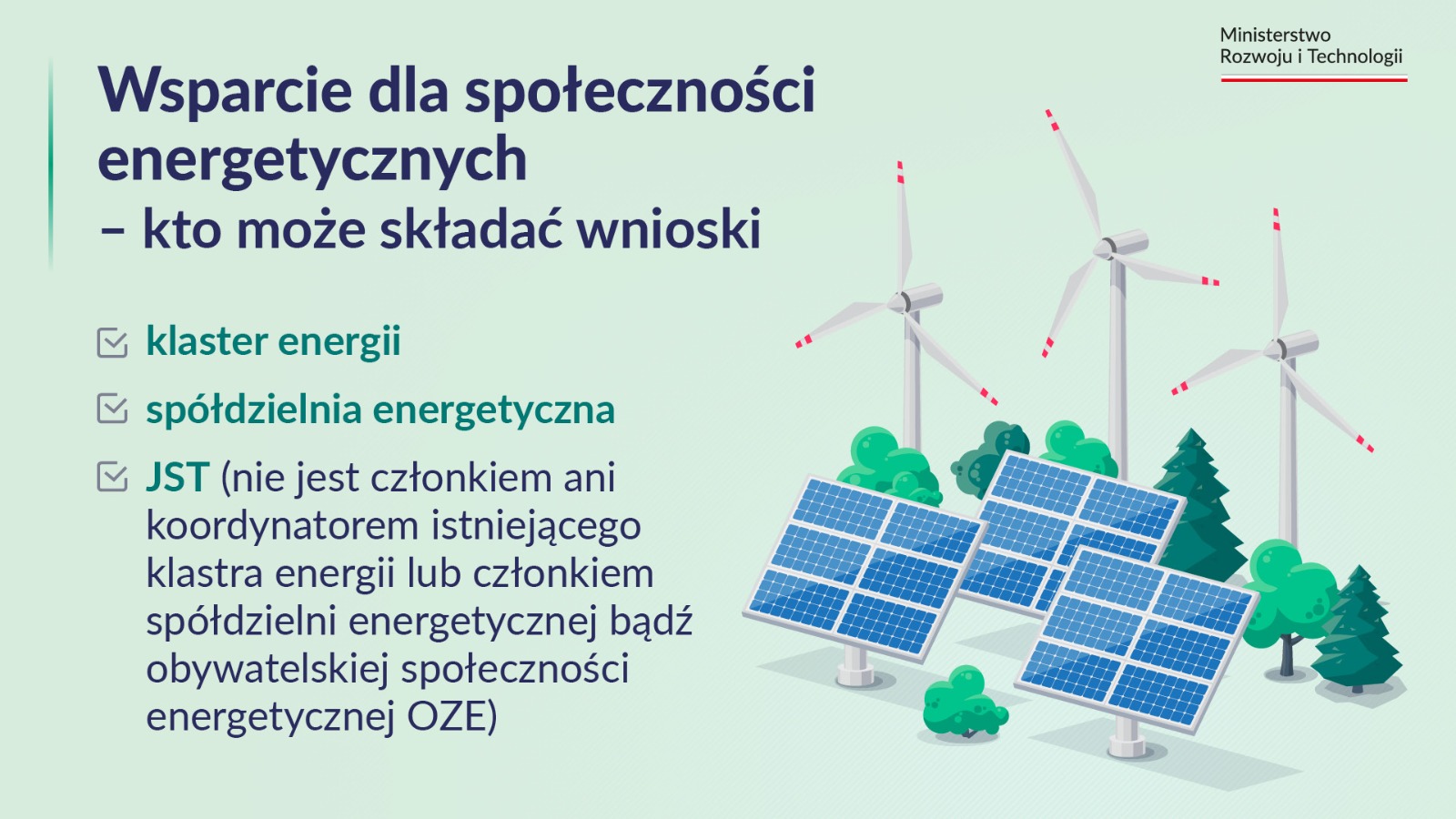 - jednostki samorządu terytorialnego, które nie są członkiem ani koordynatorem istniejącego klastra energii lub członkiem spółdzielni energetycznej bądź obywatelskiej społeczności energetycznej OZE.