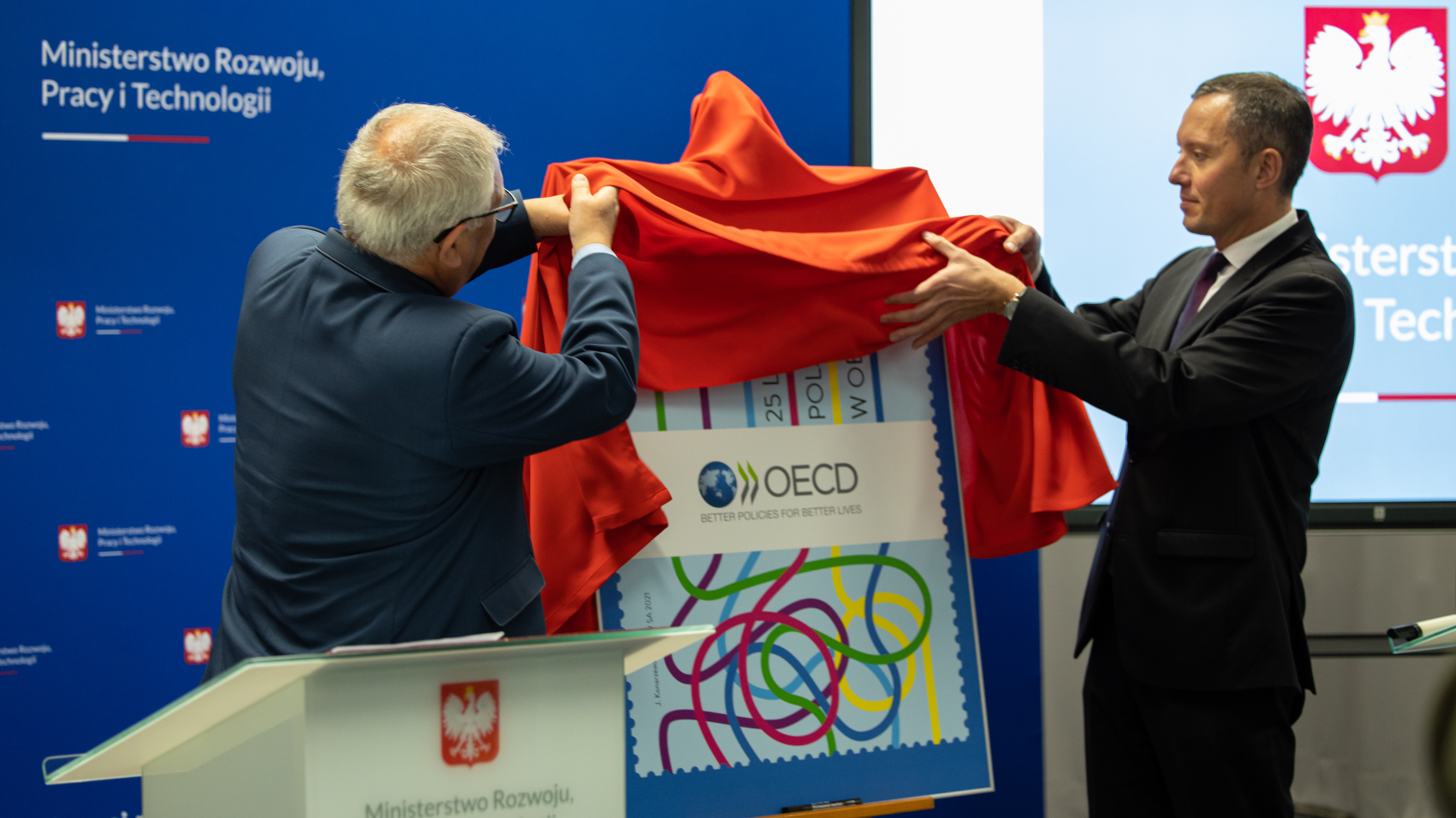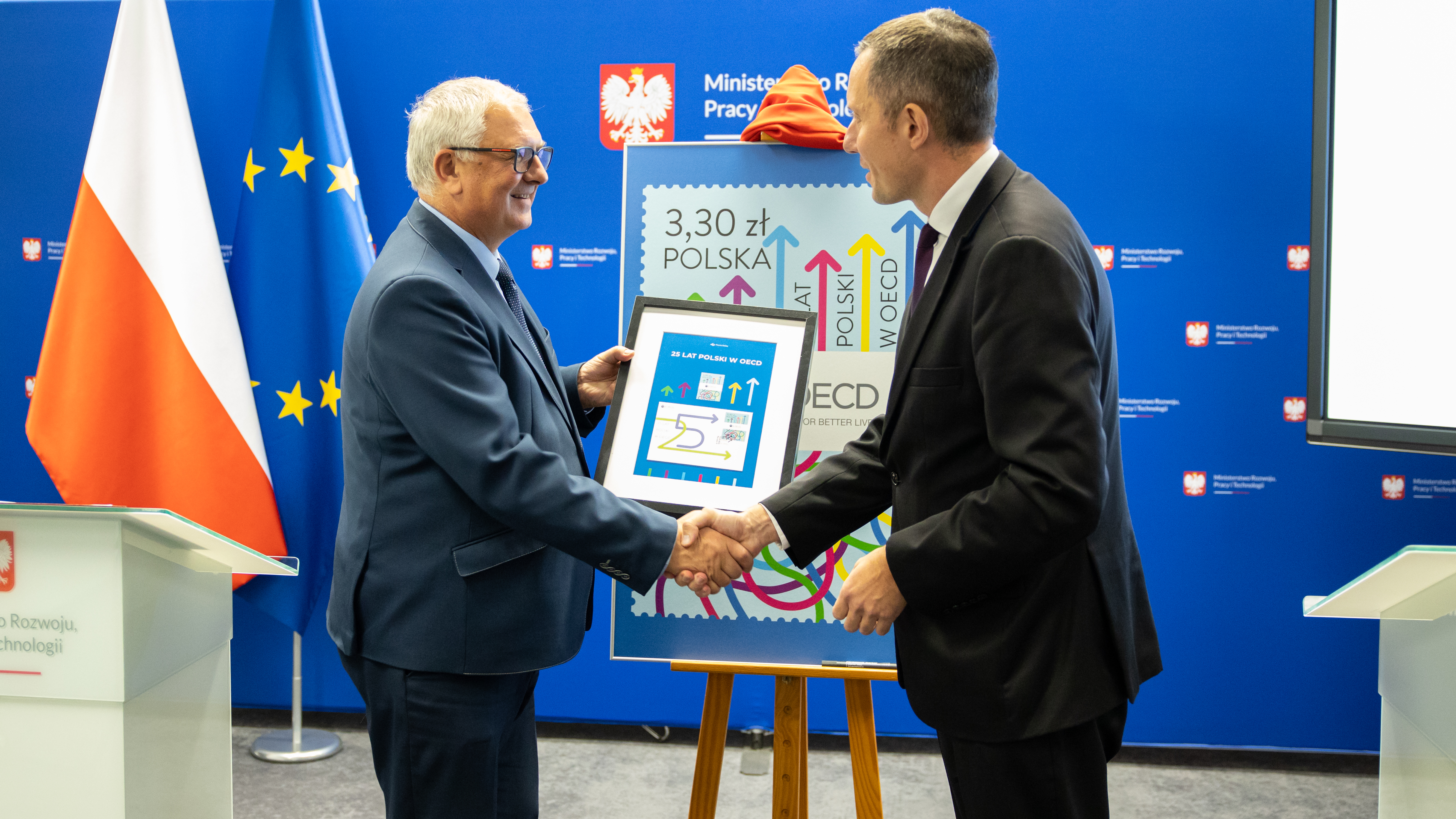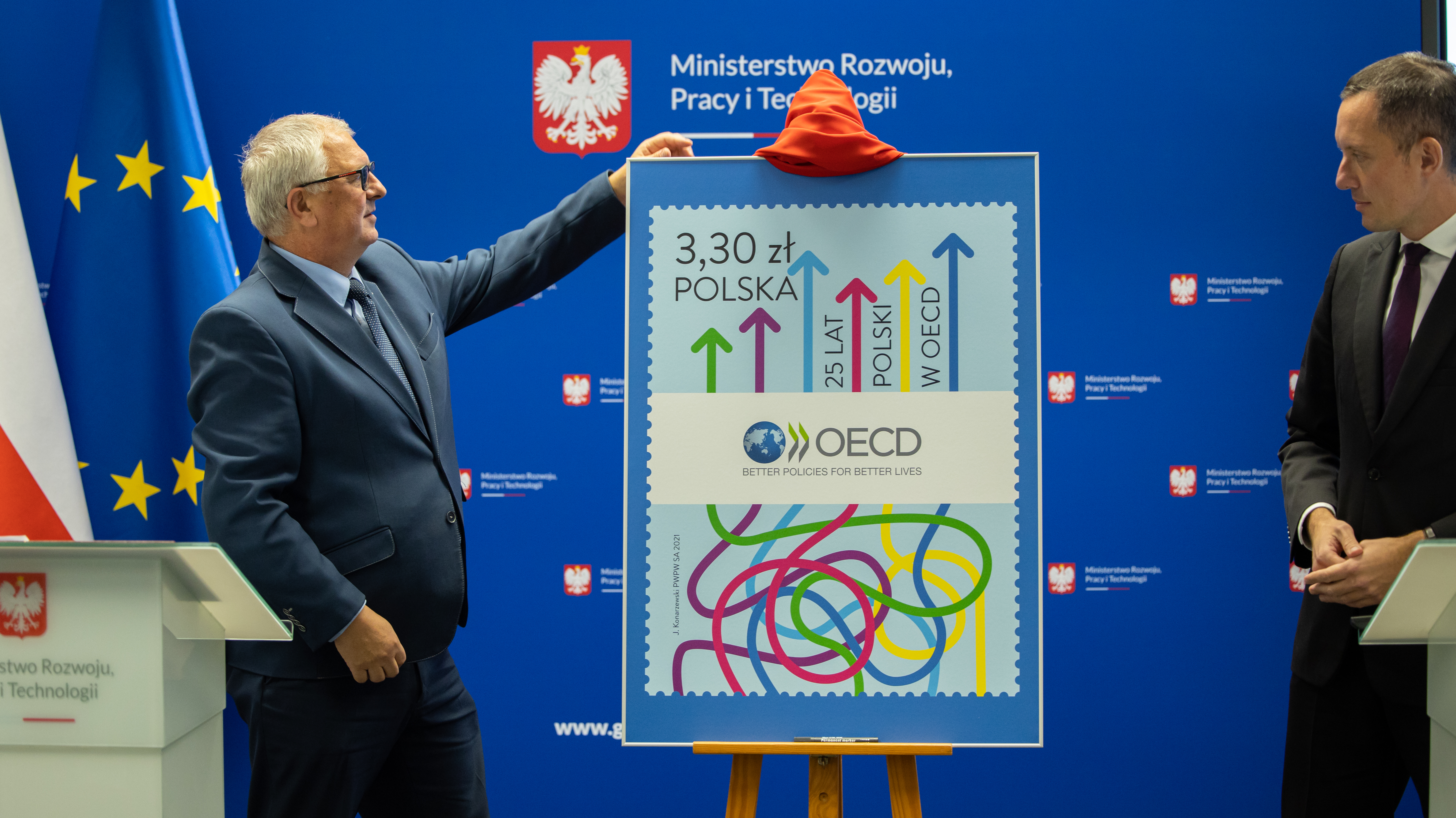 W tym roku obchodzimy jubileusz 25-lecia polskiego członkostwa w OECD. Z tej okazji Ministerstwo Rozwoju i Technologii wystąpiło z inicjatywą wydania przez Pocztę Polską znaczka okolicznościowego „25 lat Polski w OECD”. W jego oficjalnej prezentacji uczestniczyli wiceszef MRiT Grzegorz Piechowiak oraz przedstawiciele kierownictwa Poczty Polskiej.
