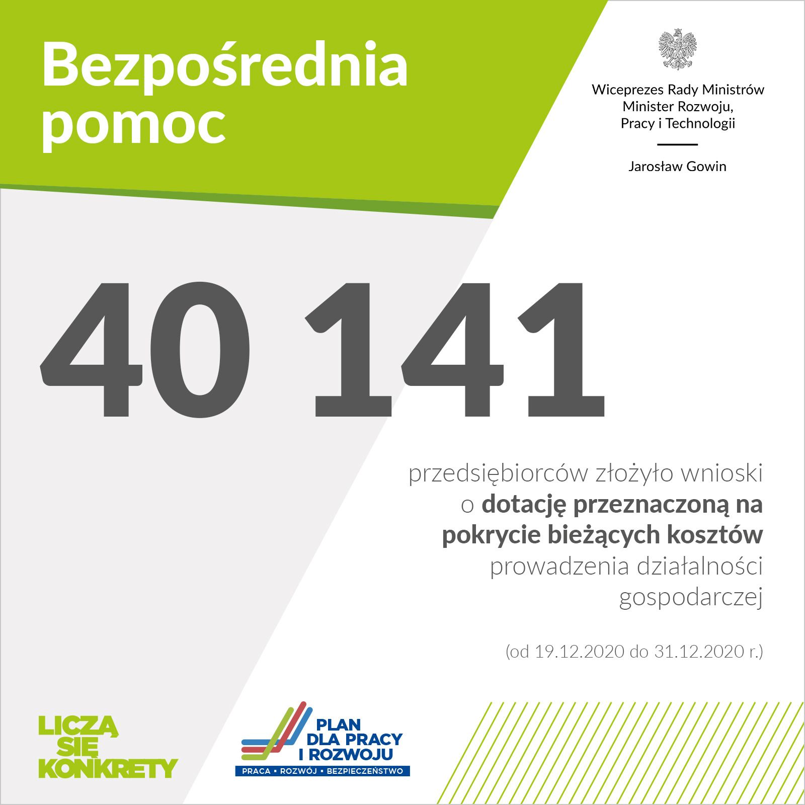 - wnioski o dotację do 5 tys. zł na pokrycie bieżących kosztów prowadzenia działalności gospodarczej złożyło 40 tys. 141 przedsiębiorców,