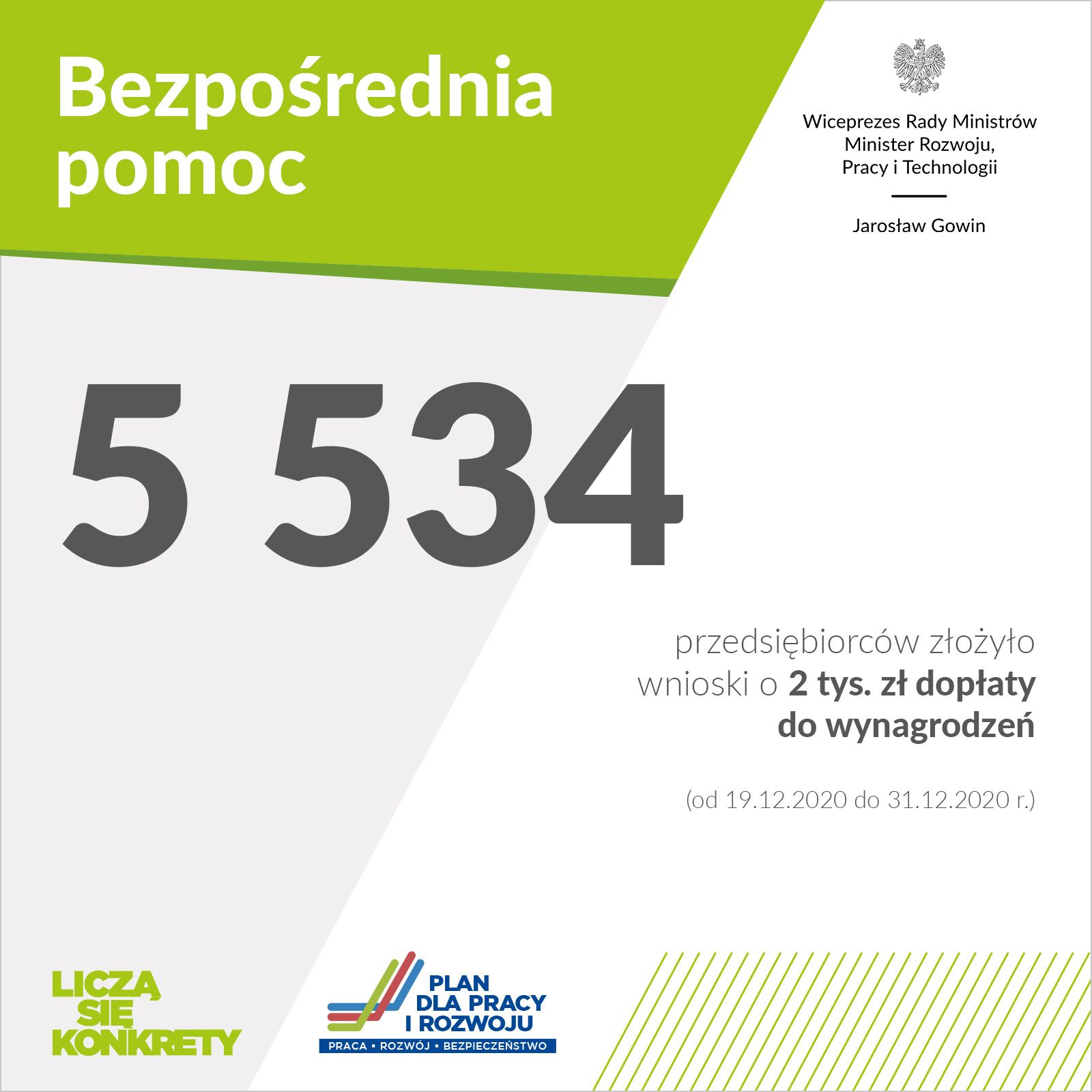 - wnioski w sprawie otrzymania 2 tys. zł dopłaty do wynagrodzeń złożyło 5 tys. 534 przedsiębiorców.