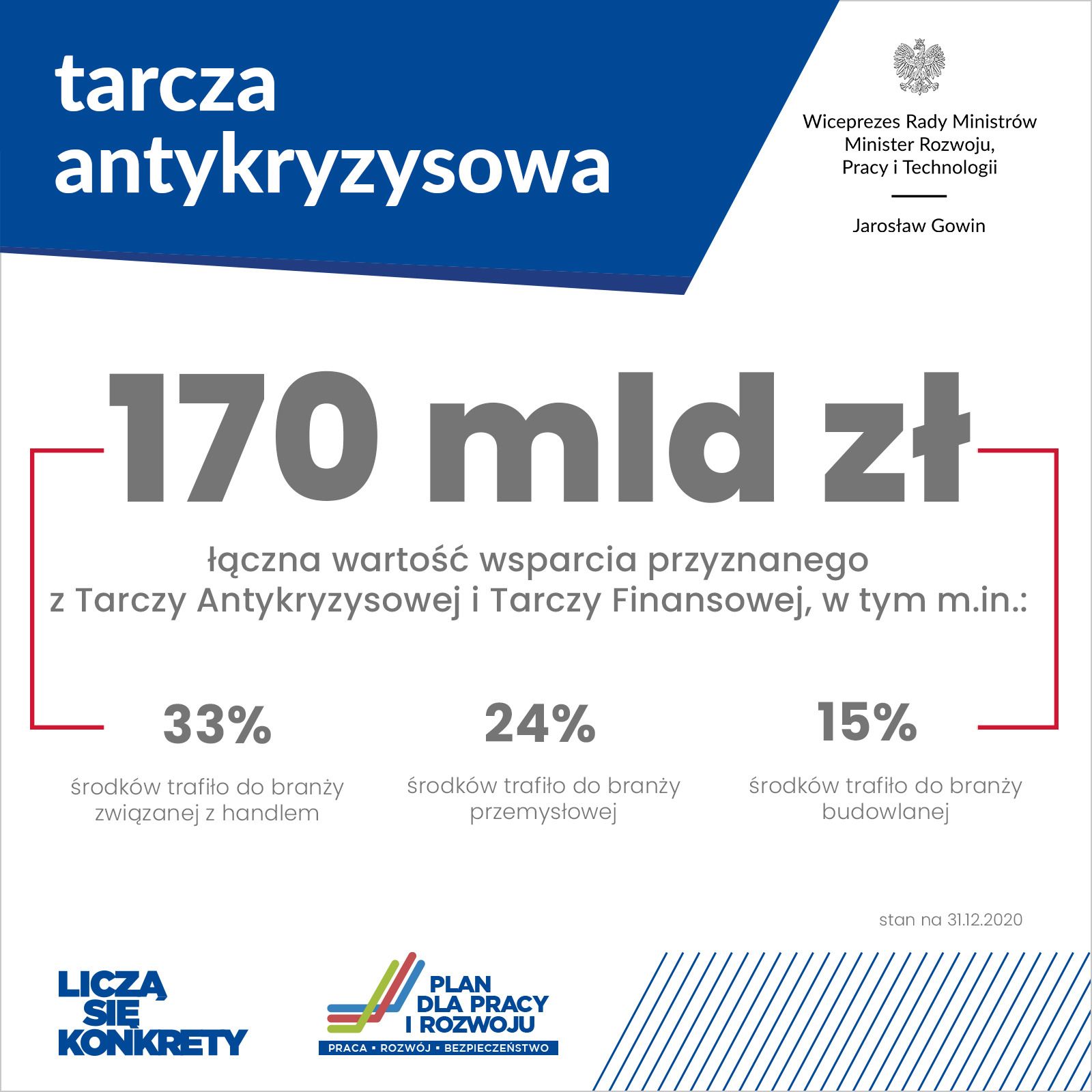 Od marca 2020 r., czyli od początku pandemii Covid-19 w Polsce jesteśmy w stałym dialogu z przedsiębiorcami. Dla wielu z nich przygotowaliśmy szereg instrumentów wsparcia. Pakiet rozwiązań ogłoszony przez rząd, który ma ochronić polskie państwo i obywateli przed kryzysem wywołanym pandemią koronawirusa, przyjął formę i nazwę Tarczy Antykryzysowej. Dzięki niej dotychczas do przedsiębiorców trafiło już ponad 172 mld zł. W tym: