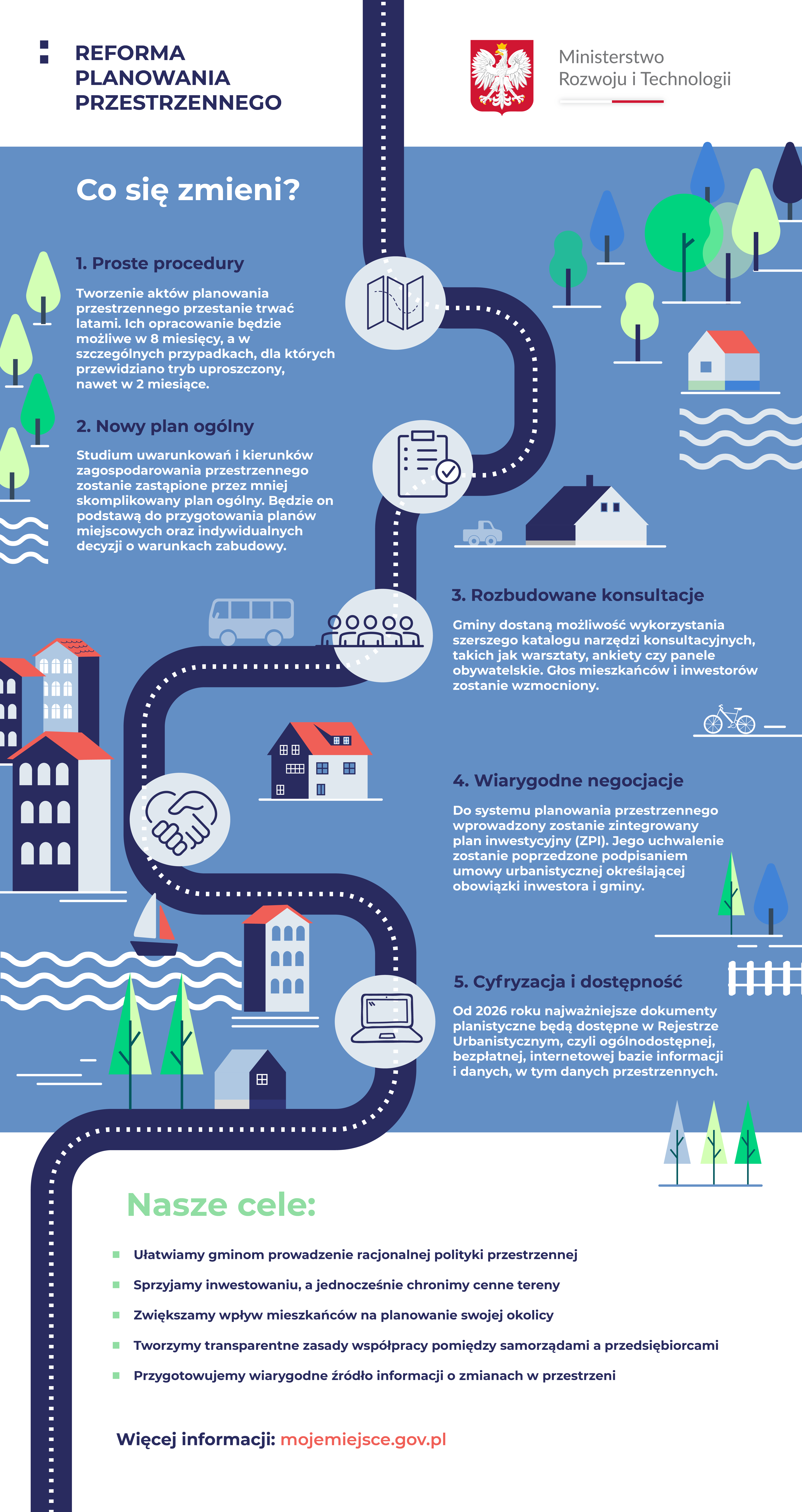Podniesienie jakości planowania przestrzennego i ograniczenie gigantycznych kosztów niekontrolowanego rozlewania się zabudowy jest jednym z naszych priorytetów. Przygotowana przez Ministerstwo Rozwoju i Technologii reforma planowania przestrzennego stanowi kompleksowy zestaw zmian, których celem jest usprawnienie planowania na poziomie lokalnym.