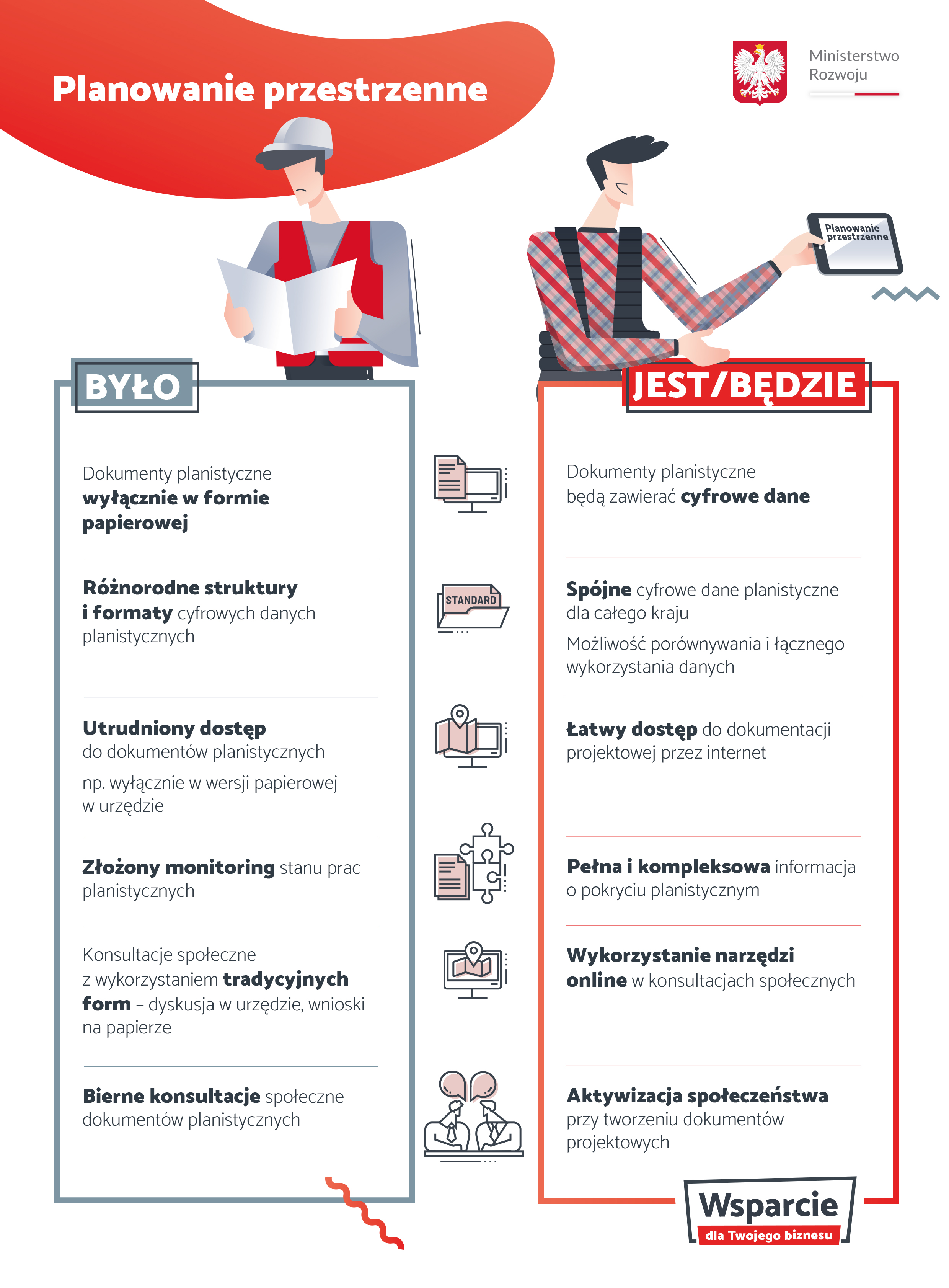Jak tłumaczy: – Nowe przepisy w ustawie o planowaniu i zagospodarowaniu przestrzennym pozwolą obywatelom i przedsiębiorcom na łatwiejszy dostęp do danych planistycznych za pośrednictwem internetu. Wprowadzą obowiązek tworzenia zbiorów danych przestrzennych dla wszystkich aktów planowania przestrzennego, wraz z określeniem ich minimalnego zakresu. Wymaganie to będzie dotyczyć również aktów już obowiązujących. Do realizacji tych zadań samorządy będą mogły wykorzystać nieodpłatnie i powszechnie dostępne oprogramowanie typu open source. W rezultacie mniej aktywne samorządy łatwiej włączą się w proces cyfryzacji planowania przestrzennego. Dzięki temu w skali kraju powstaną jednolite zbiory, które opisują zasięgi aktów planowania przestrzennego oraz powiązanych z nimi dokumentów.