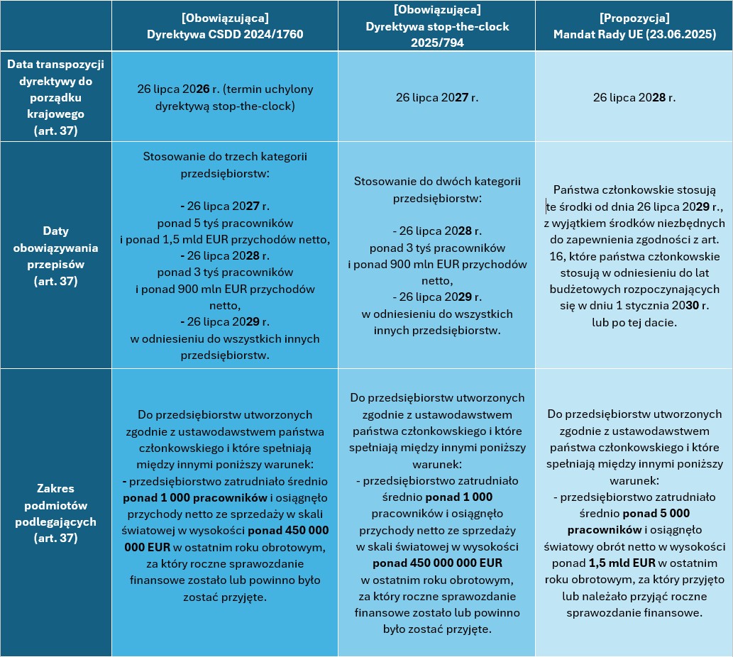 14 kwietnia 2025 r. w Dzienniku Urzędowym UE została opublikowana Dyrektywa Parlamentu Europejskiego i Rady (UE) 2025/794 z dnia 14 kwietnia 2025 r. w sprawie zmiany dyrektywy (UE) 2022/2464 i (UE) 2024/1760 w odniesieniu do dat, od których państwa członkowskie mają stosować niektóre wymogi dotyczące sprawozdawczości przedsiębiorstw w zakresie zrównoważonego rozwoju i niektóre wymogi w zakresie należytej staranności przedsiębiorstw w zakresie zrównoważonego rozwoju (tzw. dyrektywa stop-the-clock). W zakresie dyrektywy CSDDD został przesunięty termin na jej transpozycję o 1 rok (tj. do 26 lipca 2027 r.), jak również przesunięto jej stosowania o 1 rok dla pierwszej grupy spółek objętych zakresem tej dyrektywy (tj. do 26 lipca 2028 r.).