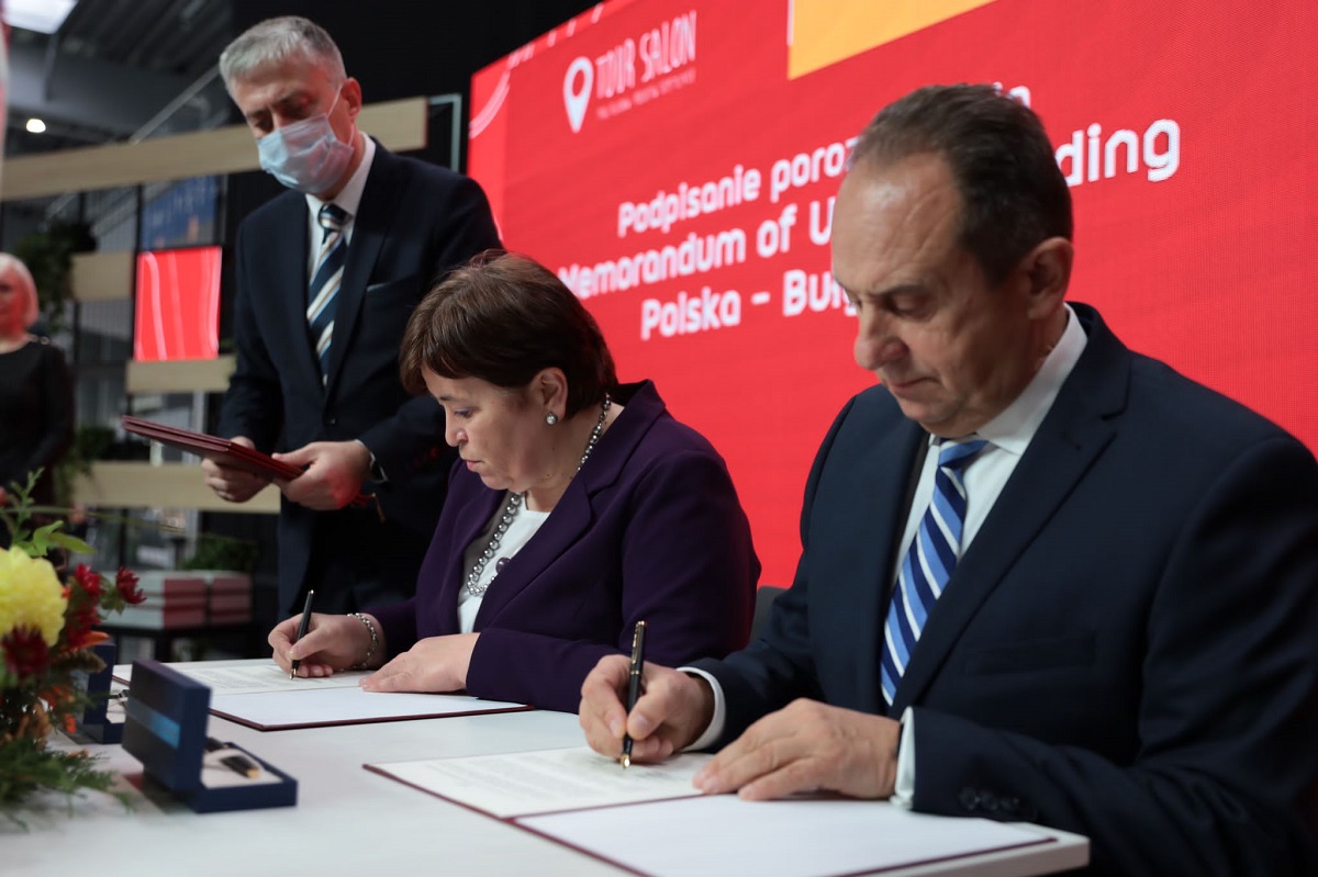Sekretarz stanu Andrzej Gut-Mostowy i minister odpowiedzialna za turystykę Bułgarii Stela Baltova podpisali dziś w Poznaniu porozumienie o współpracy między MRiT a Ministerstwem Turystyki Republiki Bułgarii. Wiceminister Andrzej Gut-Mostowy razem z minister Stelą Baltovą uczestniczyli w otwarciu Tour Salon w Poznaniu - targów regionów i produktów turystycznych.