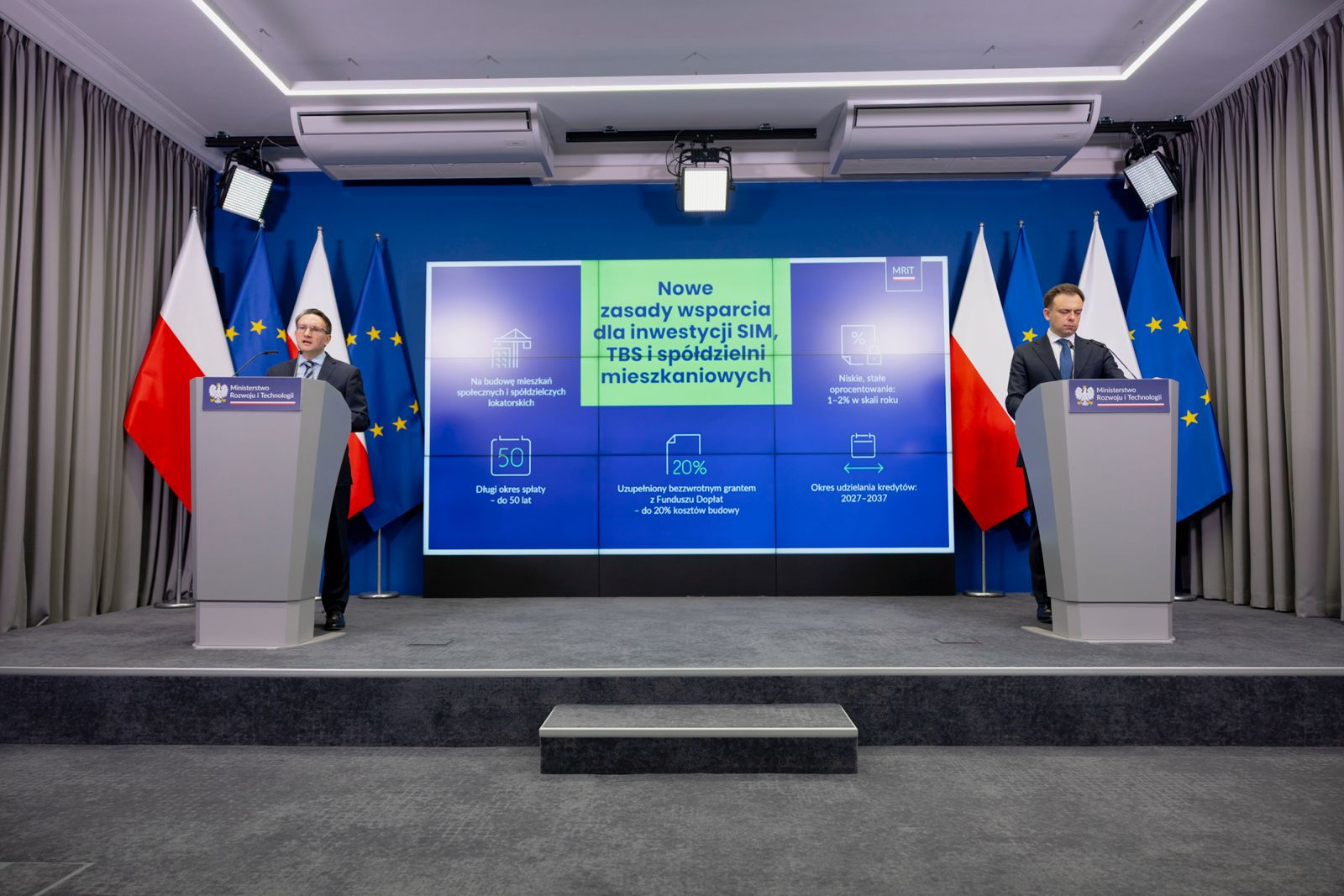 Większą podaż mieszkań w segmencie społecznym mają zapewnić nowe zasady wsparcia dla SIM-ów, TBS-ów i spółdzielni mieszkaniowych, które będą mogły liczyć na bezzwrotne granty z Funduszu Dopłat w wysokości od 15 do 20 proc. kosztów budowy (odpowiednio dla mieszkań spółdzielczych i społecznych czynszowych). Pozostałe koszty będzie można sfinansować preferencyjnym kredytem z BGK z okresem kredytowania do 50 lat, stałym rocznym oprocentowaniem w wysokości 1 proc. dla społecznych mieszkań czynszowych i 2 proc. dla mieszkań spółdzielczych, przy czym bezzwrotne wsparcie i preferencyjny kredyt będą udzielane w jednym postępowaniu. Kredyty takie będą udzielane w latach 2027-2037.