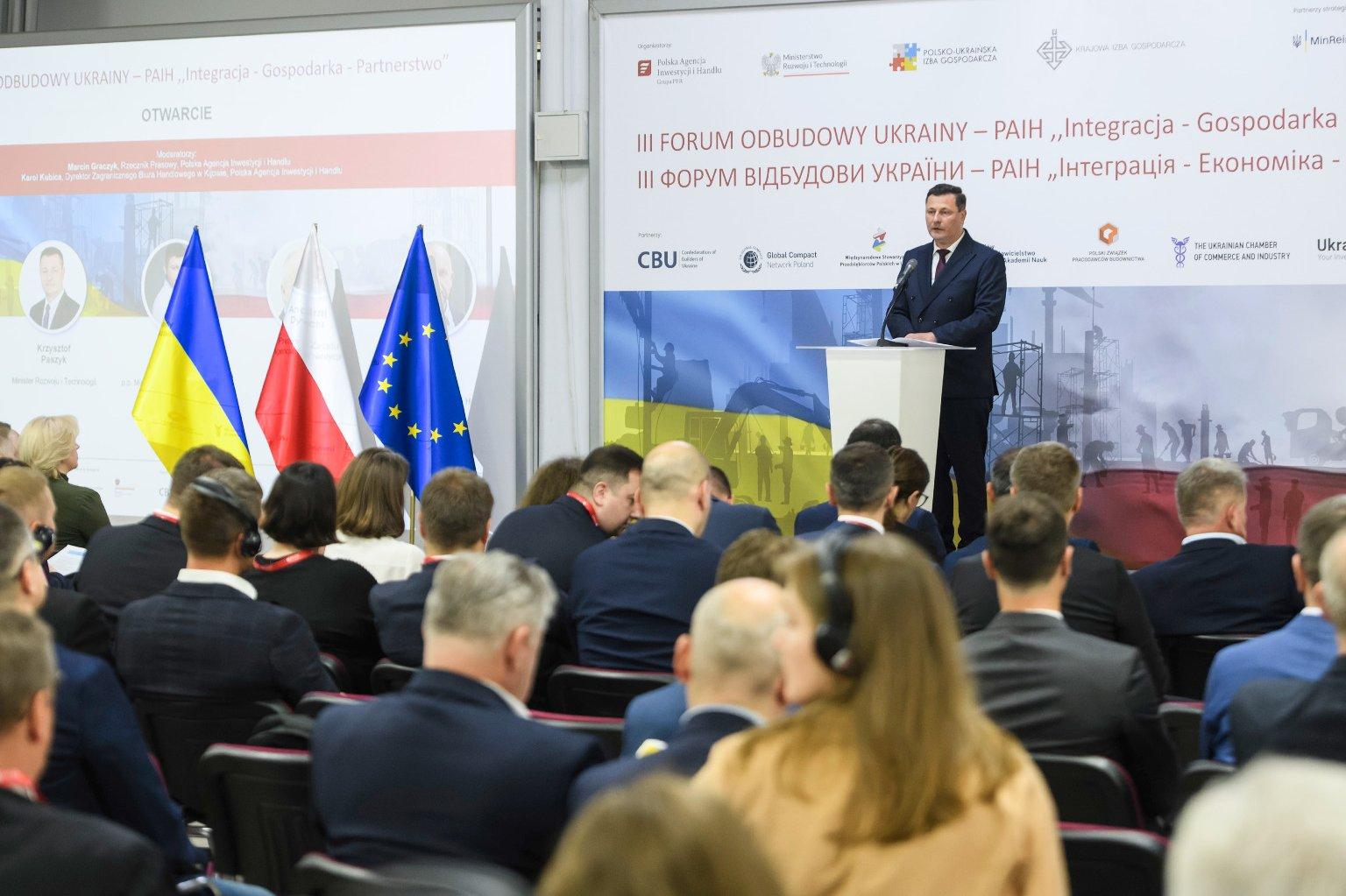 – Nasza solidarność w sferze wojskowej powinna pociągać za sobą solidarność w sferze gospodarczej. Dziś chcemy rozmawiać o wymiarze gospodarczym współpracy i biznesowej działalności na terenie Ukrainy – podkreślił minister Krzysztof Paszyk otwierając Forum Odbudowy Ukrainy. W Kijowie trwa trzecia edycja wydarzenia, będącego platformę do nawiązania współpracy polskich firm z ukraińskimi oraz z międzynarodowymi partnerami.