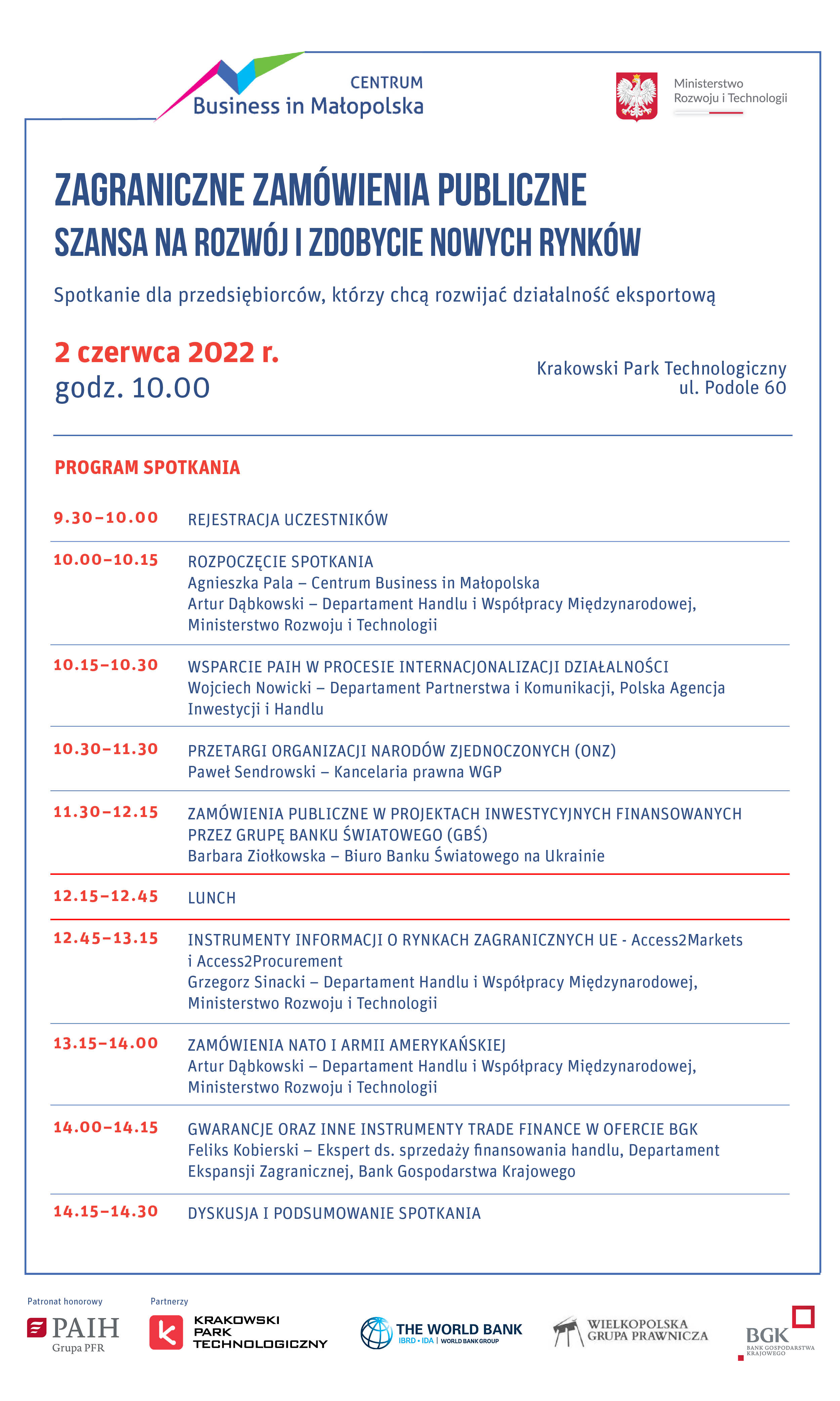Wszystkich przedsiębiorców, który chcą rozwijać działalność eksportową poprzez udział w zamówieniach publicznych organizacji międzynarodowych, zapraszamy do uczestnictwa w seminarium w Krakowie 2 czerwca 2022 r., organizowanym przez Ministerstwo Rozwoju i Technologii i Centrum Business in Małopolska.