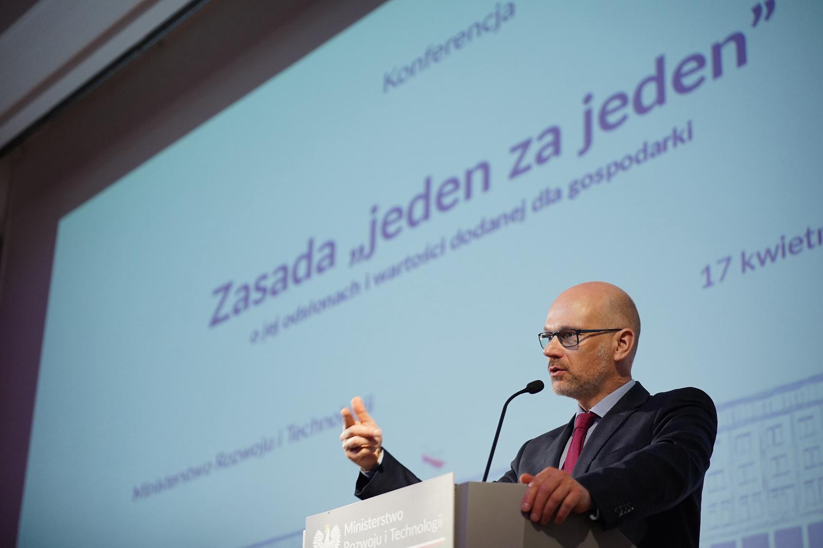 W trakcie konferencji Minister do spraw Nadzoru nad Wdrażaniem Polityki Rządu Maciej Berek zaprezentował miejsce i znaczenie zasady "jeden za jeden" w rządowym procesie legislacyjnym.