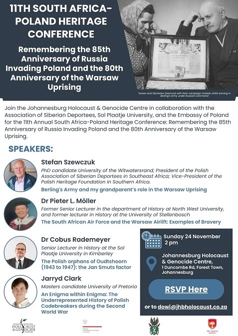 W dniu 24.11.2024 r. w Johannesburgu odbyła się jedenasta już edycja Konferencji Historycznej Polska – RPA pod hasłem „Upamiętnienie 85. rocznicy inwazji Rosji na Polskę i 80. rocznicy Powstania Warszawskiego”.