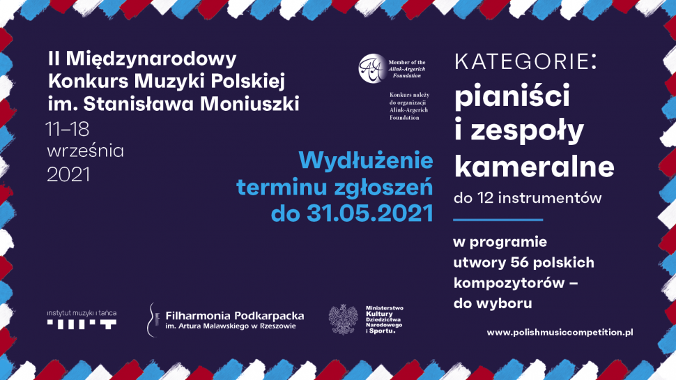 Do 31 maja br. można się zgłaszać do Międzynarodowego Konkursu Muzyki Polskiej im. Stanisława Moniuszki. Druga edycja Konkursu odbędzie się od 11 do 18 września 2021 roku w Filharmonii Podkarpackiej im. Artura Malawskiego w Rzeszowie. Uczestnicy powalczą łącznie o pulę nagród w wysokości ponad osiemdziesięciu tysięcy euro w dwóch kategoriach – pianistycznej i zespołów kameralnych. Organizatorem konkursu jest Instytut Muzyki i Tańca, zaś fundatorem głównych nagród finansowych Ministerstwo Kultury, Dziedzictwa Narodowego i Sportu.