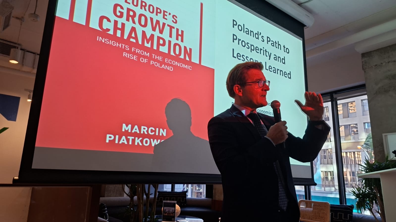 Prof. Marcin Piątkowski – ekonomista, wykładowca akademicki, profesor Akademii Leona Koźmińskiego, od lat związany z Bankiem Światowym – zaprezentował niezwykle interesujący wykład, w którym wyjaśnił zgromadzonym w jaki sposób Polska, po trudnym okresie wojen, komunizmu, stojąc na progu zapaści gospodarczej, w ciągu zaledwie 35 lat zdołała nie tylko przeprowadzić transformację i w pełni włączyć się do systemu wolnorynkowego, ale stać się prawdziwym liderem wzrostu.