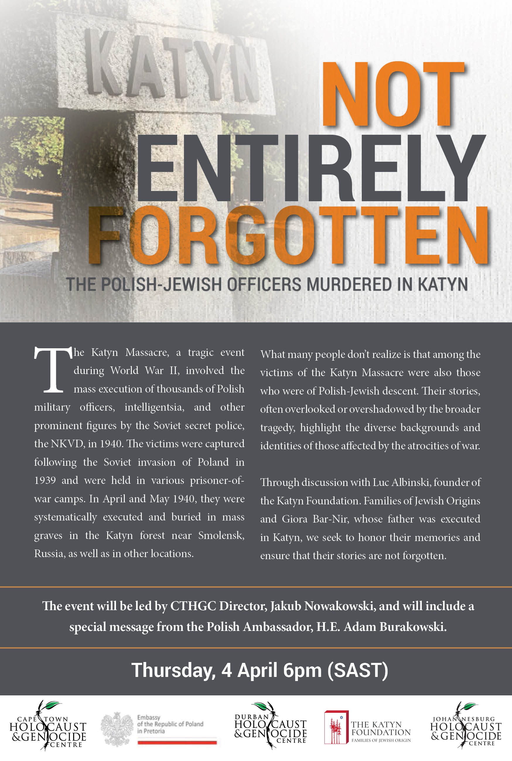 Webinarium poświęcone było pamięci żydowskich i nieżydowskich oficerów zamordowanych przez Sowietów w Katyniu i innych miejscach masowych mordów, a także upowszechnienie wiedzy na temat tych dramatycznych wydarzeń południowoafrykańskiej publiczności. Wśród blisko 22 tysięcy polskich obywateli, ofiar Zbrodni Katyńskiej, ponad 400 osób było żydowskiego pochodzenia. Wydarzenie moderował dyrektor Jakub Nowakowski (wcześniej dyrektor Muzeum Żydowskiego Galicja w Krakowie). W webinarium wzięli udział Ambasador Adam Burakowski, Luc Albiński (współzałożyciel i prezes zarządu Fundacji Rodzin Katyńskich Żydowskiego Pochodzenia) oraz Giora Bar-Nir, którego ojciec został zamordowany w Katyniu. W trakcie wydarzenia przedstawiono również działalność Fundacji Rodzin Katyńskich Żydowskiego Pochodzenia.