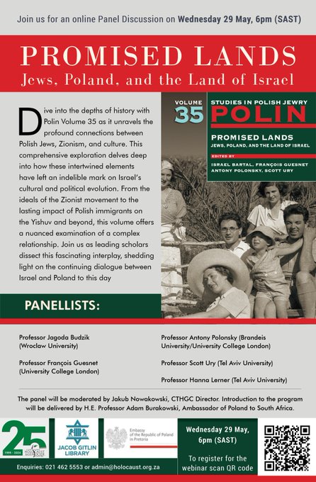 Centrum Holokaustu i Ludobójstwa w Kapsztadzie zorganizowało webinarium pt. „Ziemie obiecane. Żydzi, Polska i Ziemia Izraela”. Wydarzenie poświęcone było ostatniemu tomowi anglojęzycznej publikacji naukowej: POLIN. Studies in Polish Jewry, której przedmiotem tym razem (to już 35 tom tego wydawnictwa) są relacje pomiędzy Polską i polskimi Żydami a ziemią Izraela (przed 1948) i Izraelem (po 1948).
