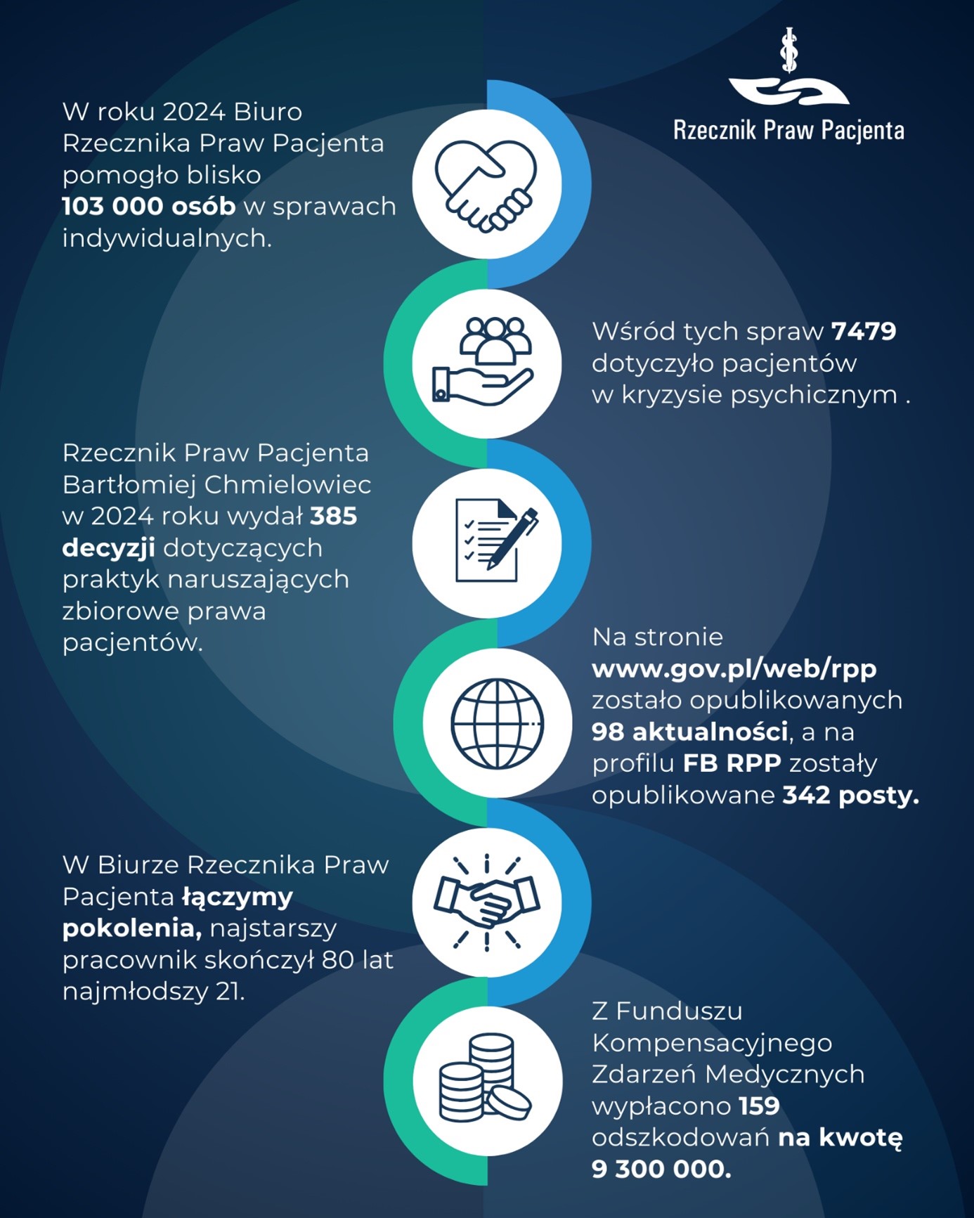 Realizujemy zadania opisane w ustawie o prawach pacjenta i Rzeczniku Praw Pacjenta, m.in. stoimy na straży przestrzegania praw pacjenta, badamy czy nie nastąpiło naruszenie tych praw – zarówno w sprawach indywidualnych, jak i zbiorowych, prowadzimy całodobową Telefoniczną Informację Pacjenta, obsługujemy fundusze kompensacyjne, m.in. Fundusz Kompensacyjny Zdarzeń Medycznych, prowadzimy działania informacyjne i edukacyjne na temat praw pacjenta oraz zdrowia, systemu ochrony zdrowia.