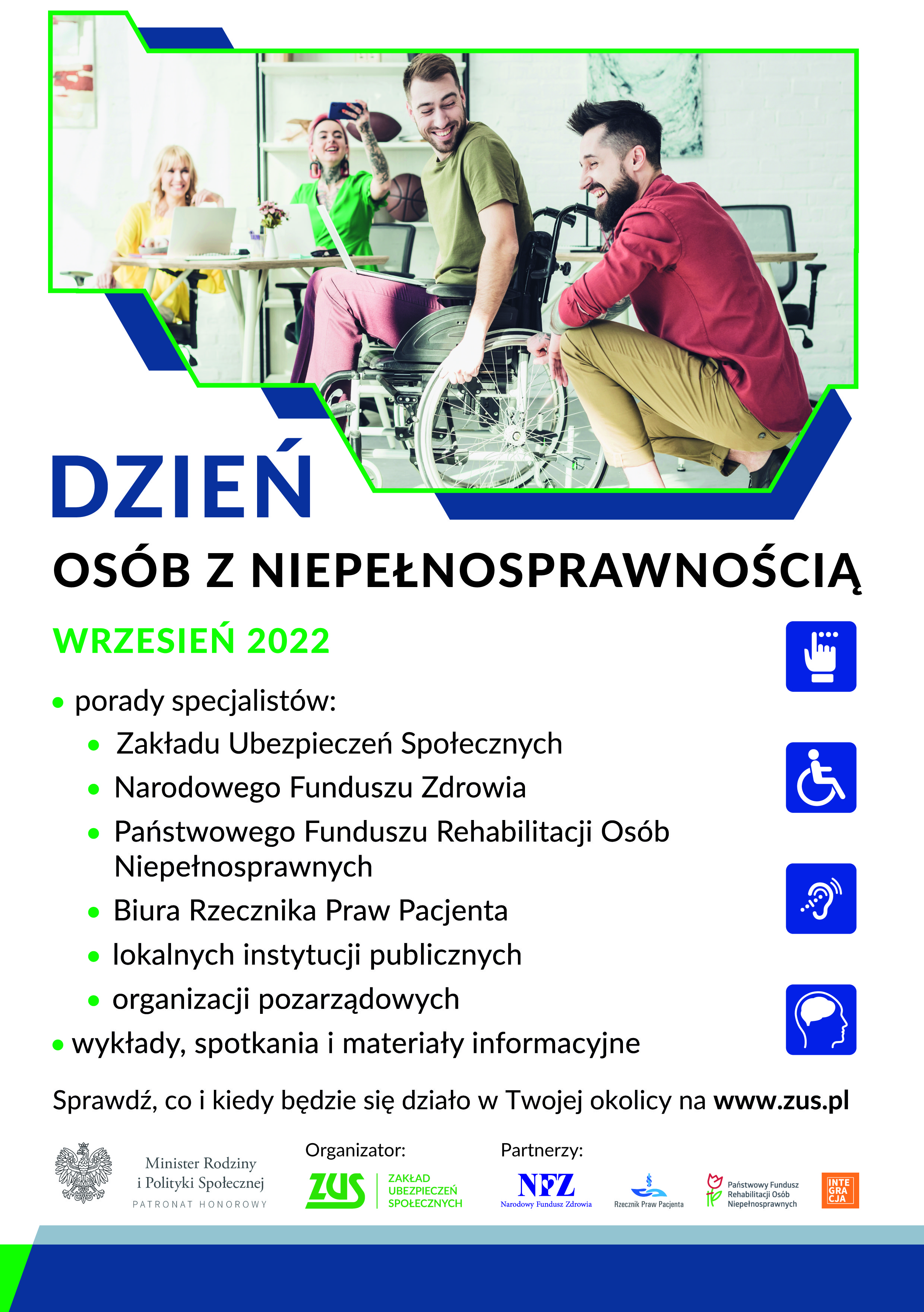 We wrześniu zapraszamy na Dzień Osób z Niepełnosprawnością w ZUS. Jest to cykl wydarzeń w całej Polsce, podczas których zainteresowani będą mogli skorzystać z porad ekspertów ZUS oraz skonsultować się ze specjalistami instytucji partnerskich. Wszystkie spotkania mają charakter otwarty, a udział w nich jest bezpłatny.