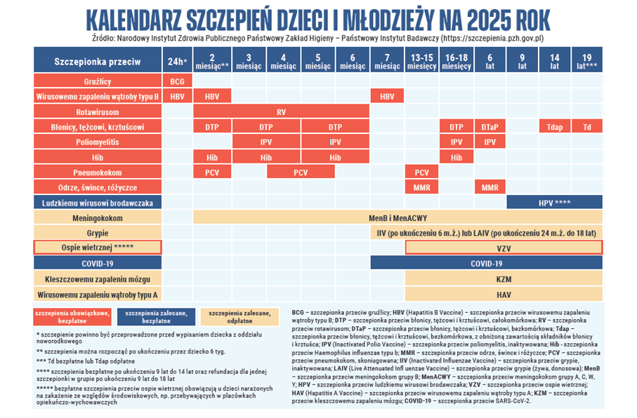 Rodzicu, pamiętaj, że szczepienia ochronne to najbezpieczniejszy i najskuteczniejszy sposób ochrony dziecka przed wieloma groźnymi chorobami zakaźnymi. Nowoczesne szczepionki są dobrze tolerowane, a efekty uboczne występują bardzo rzadko. W Polsce szczepienia obowiązkowe są bezpłatnie realizowane do 19 roku życia, jednak refundacji podlega coraz więcej szczepień zalecanych. Informacje o szczepieniach refundowanych można znaleźć m.in. na stronach Ministerstwa Zdrowia oraz portalu Narodowego Instytutu Zdrowia Publicznego Państwowego Zakładu Higieny www.szczepienia.pzh.gov.pl.