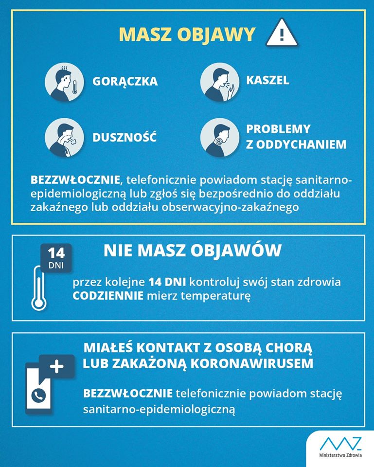 - Ministerstwo Zdrowia, Główny Inspektorat Sanitarny oraz Narodowy Instytut Zdrowia Publicznego na swoich stronach internetowych oraz w mediach społecznościowych regularnie publikują informacje oraz zalecenia dotyczące sytuacji zagrożenia zakażenia koronawirusem